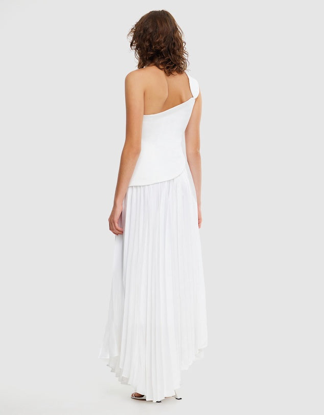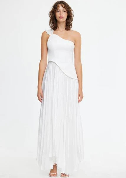 Introducing the Grangecourt Maxi Dress in Ivory, a stunning and sophisticated piece that embodies modern elegance. The dress features a bonded fitted bodice and a one-shoulder design with asymmetrical bodice detail, creating a unique silhouette.