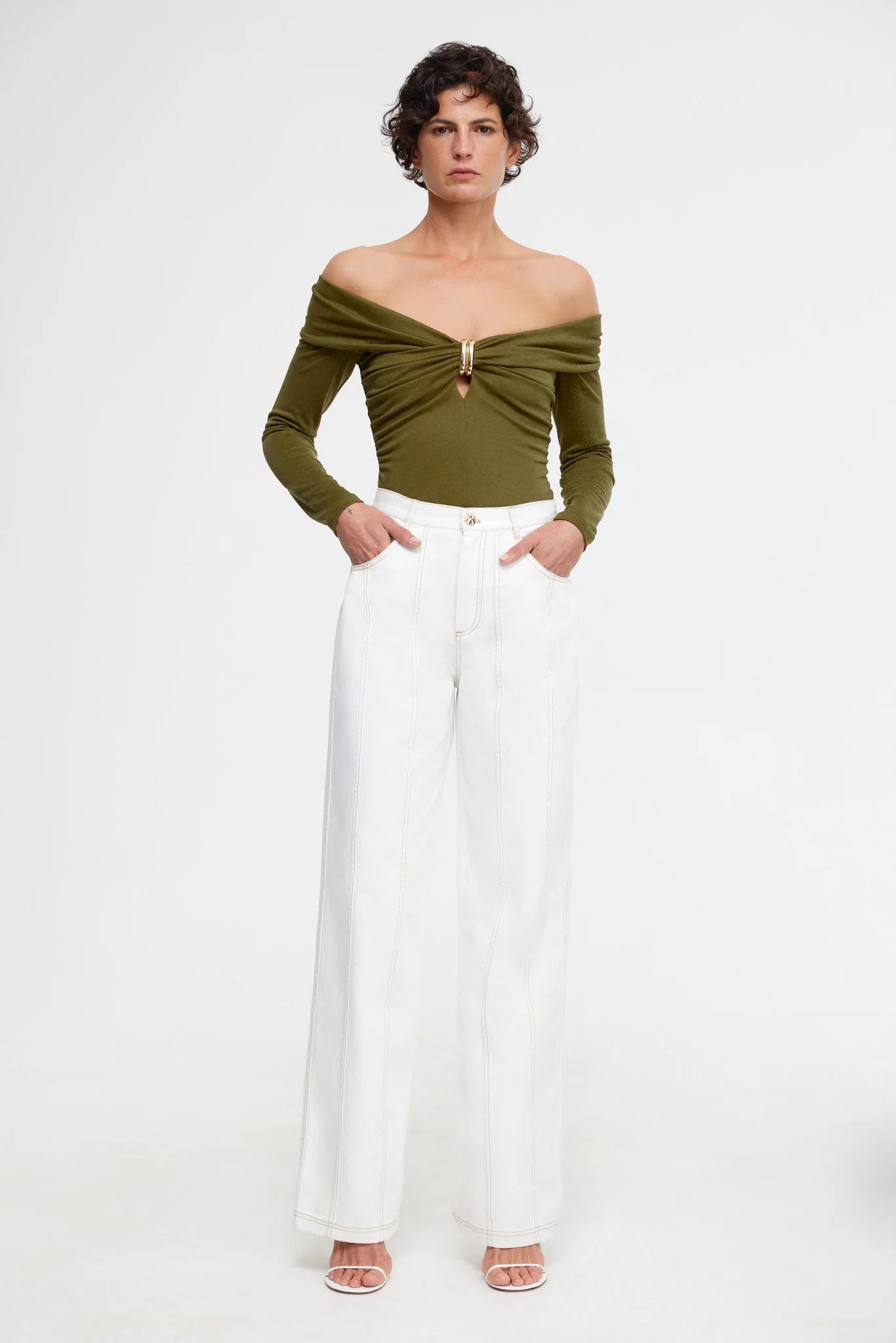 A relaxed fit silhouette, perfect for everyday styling. The Valleybrook Jean in Ivory are crafted from a structured cotton fabrication. Designed to sit at the waist, featuring contrast stitching, functional pockets and polished off with gold hardware.