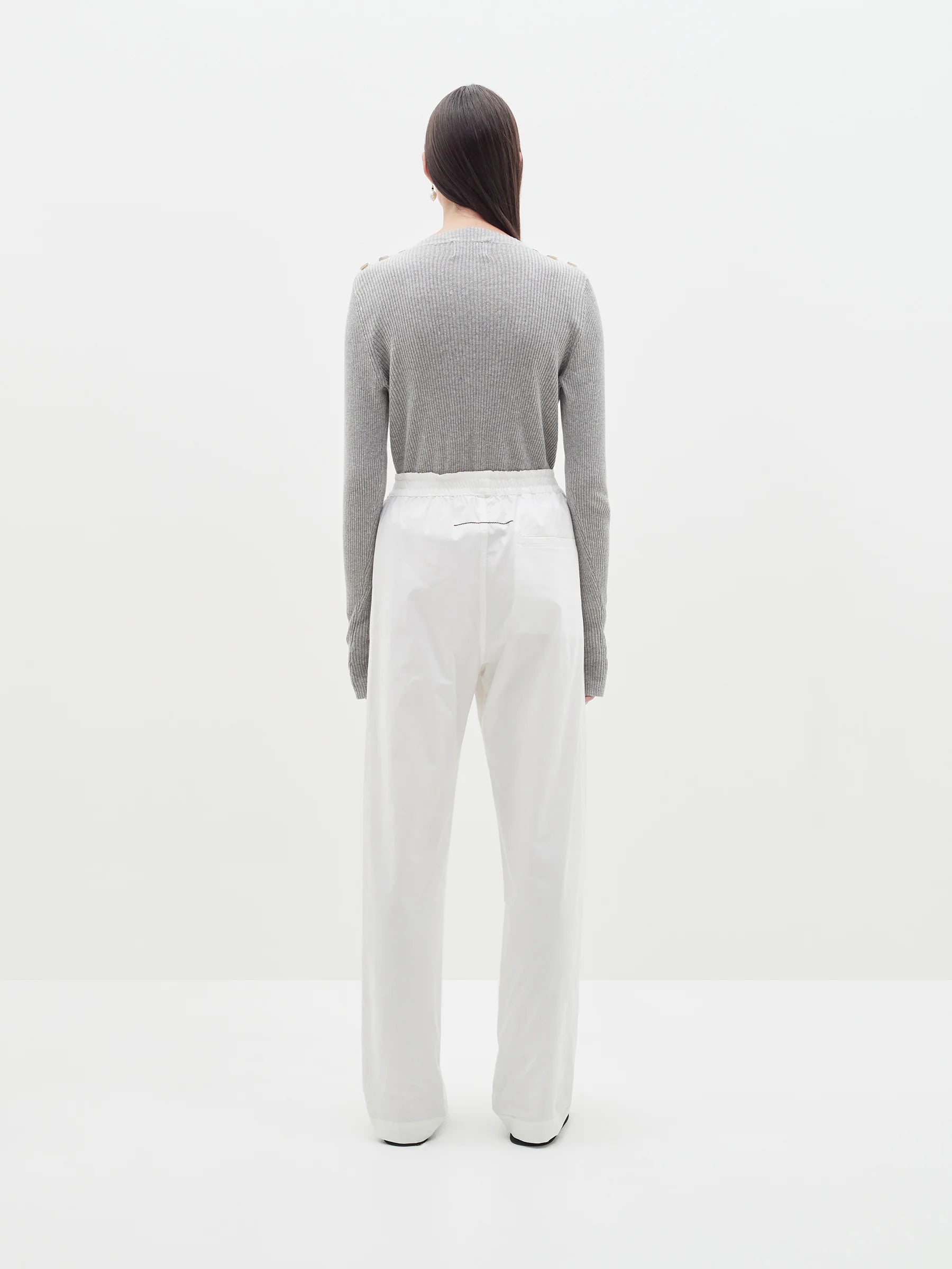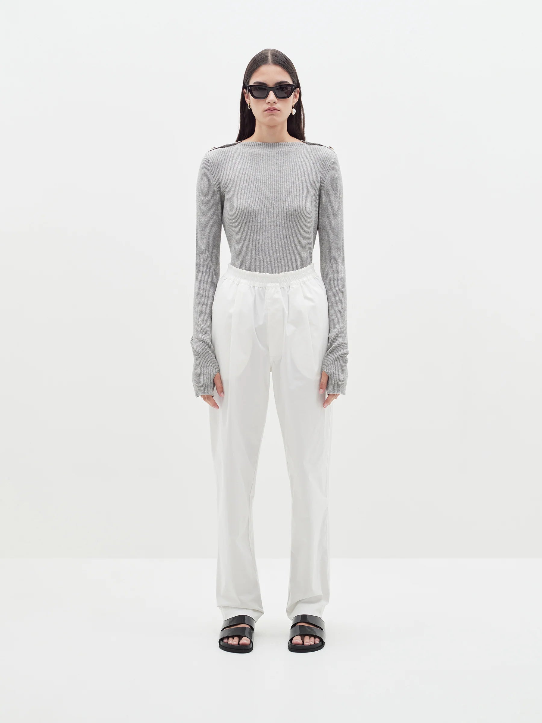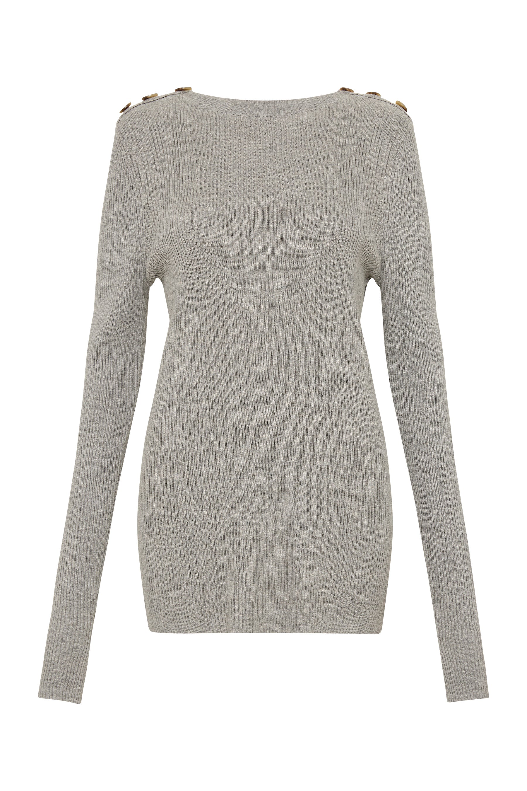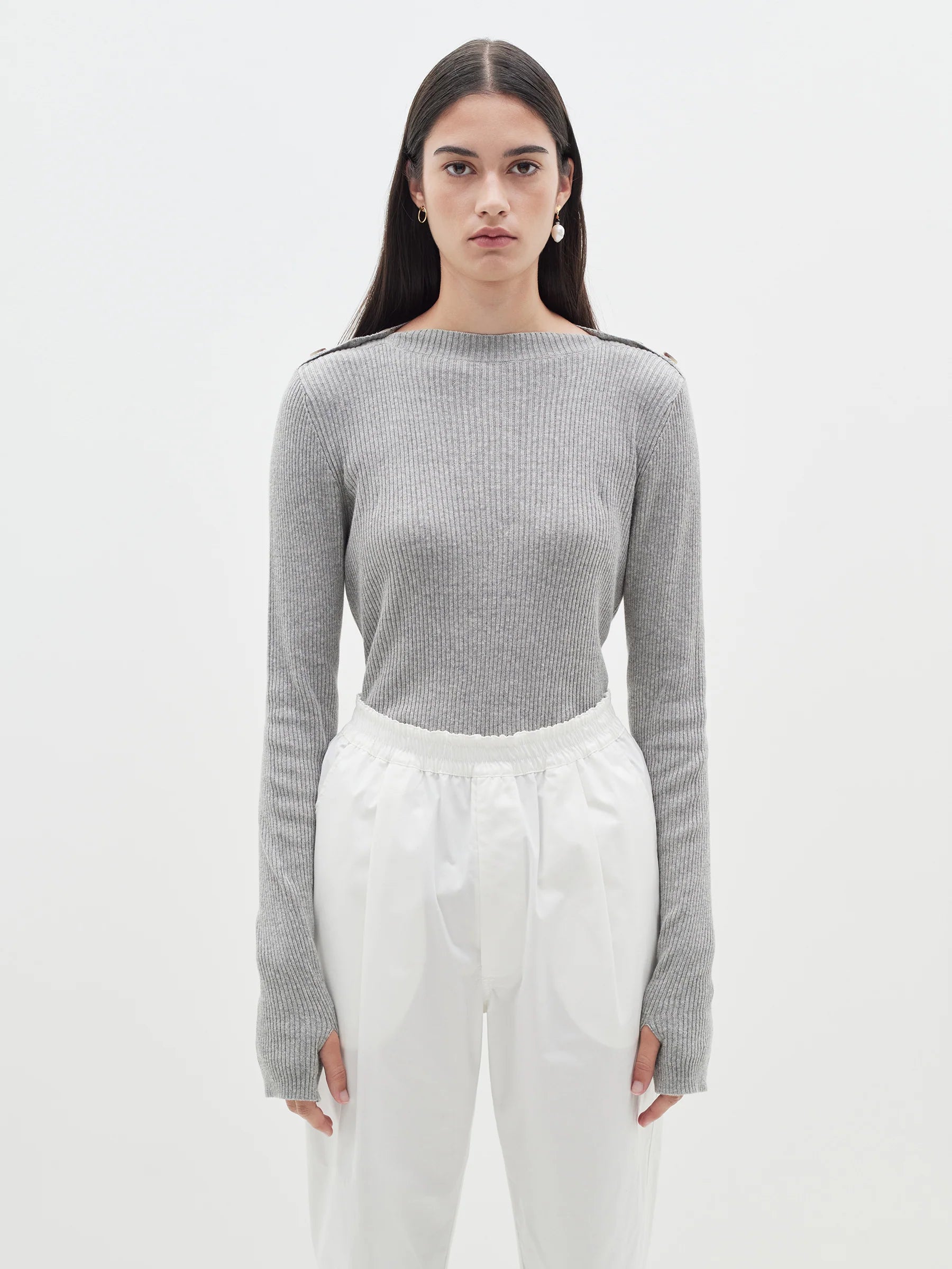 a slim fit, long sleeve knit constructed from a linen cotton blend. designed to be a layering piece, featuring an elongated boat neckline and button detail along the shoulders.