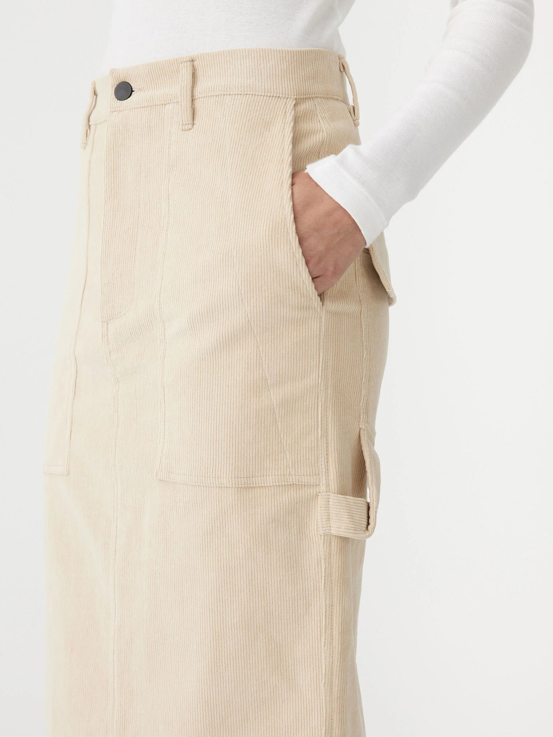 crafted from fine brushed cotton corduroy blended with spandex, the cord utility skirt boasts a straight-line silhouette. a nod to utility style detailing, this style is complete with the rear patch and dropped carpenter pockets, hammer loops and a centre back vent split.