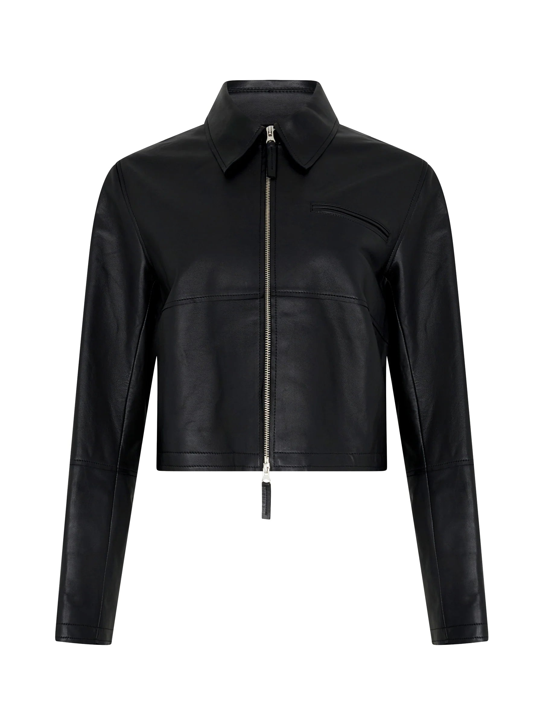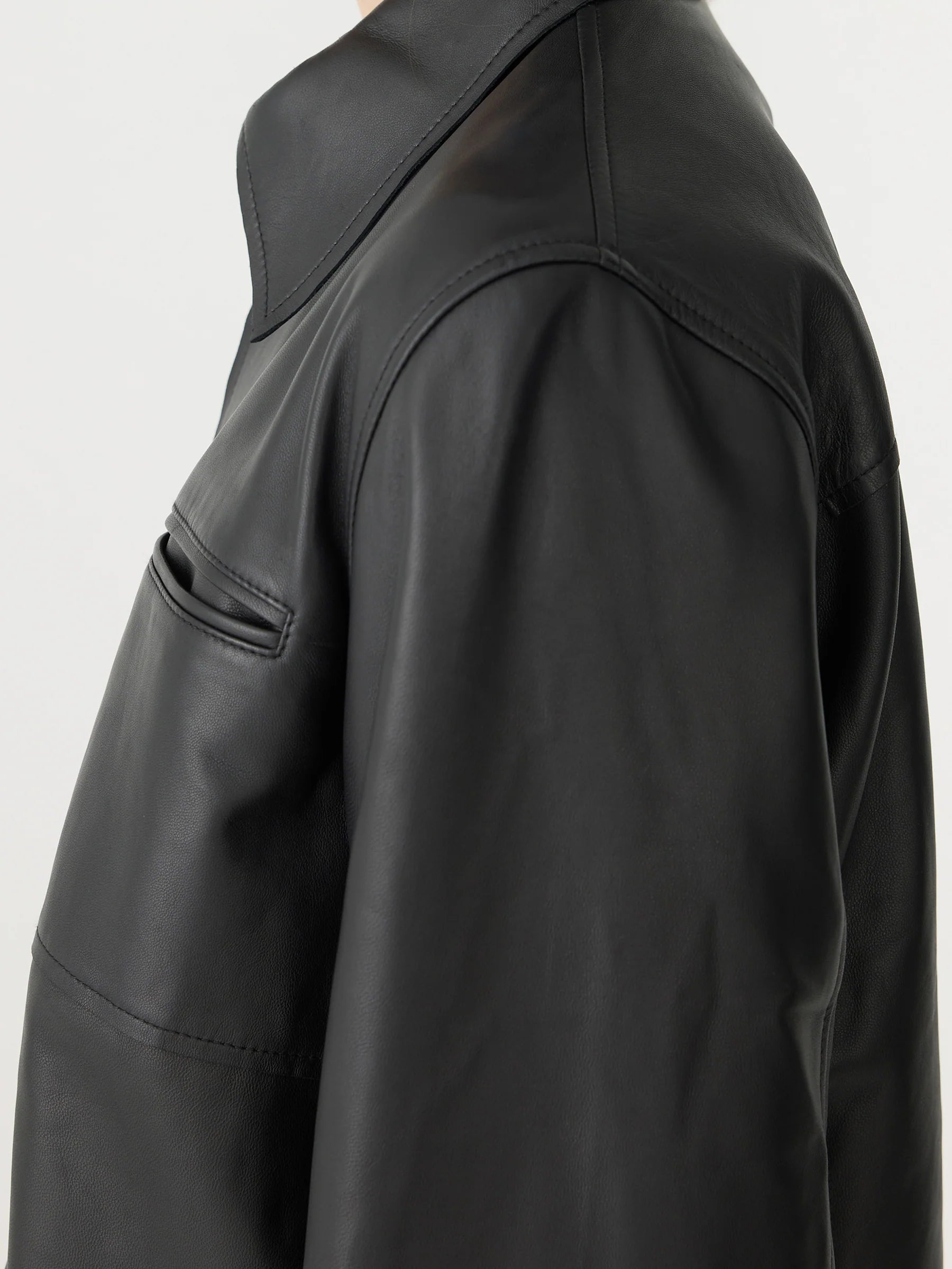 A timeless jacket redefined in fully lined Italian leather for a balance of softness and structure, the Leather Minimal Jacket is designed for a regular fit in a cropped length. This style features a double-ended zip with raw edging throughout. Detailed with a front chest pocket, side seam pockets, and an internal jet pocket with flap. Finished with heavy topstitching, a front panel through the waist and a curved back yoke.