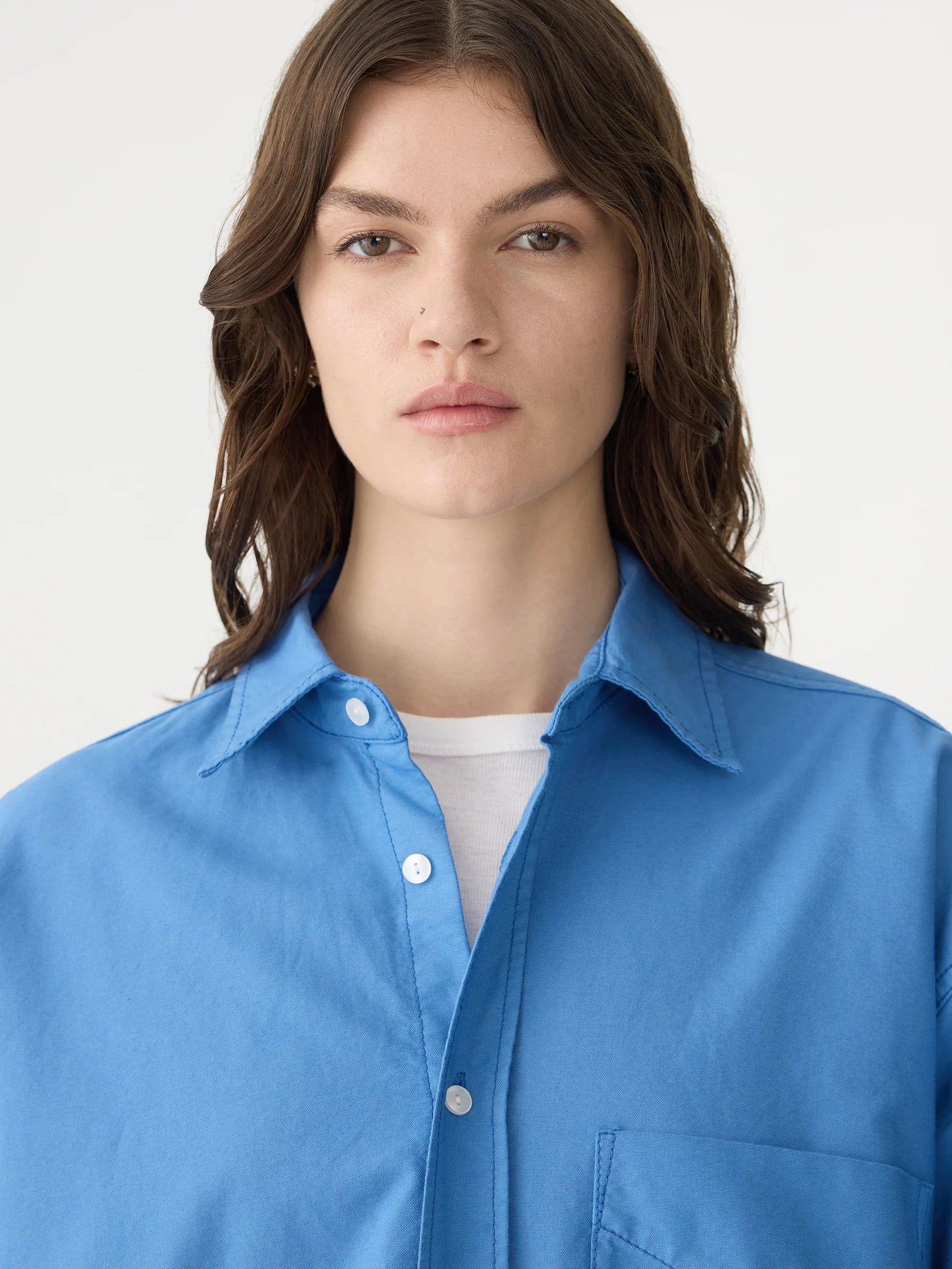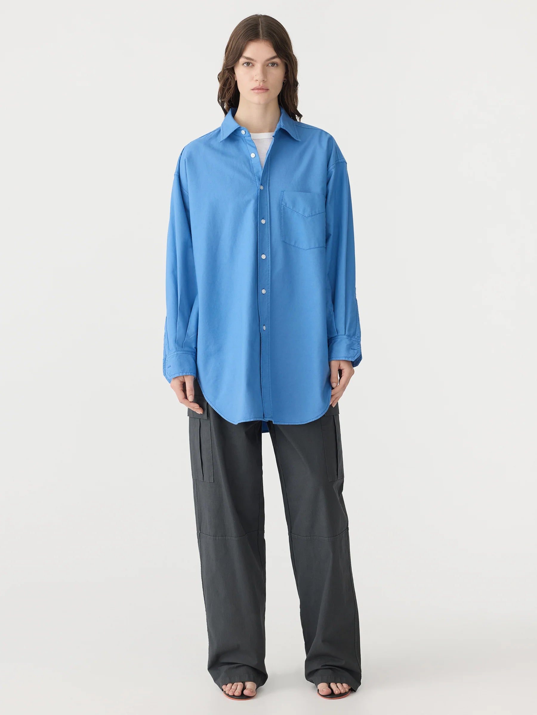 Crafted from pinpoint oxford in a yarn-dyed basket weave, the Oversized Pinpoint Shirt is made from lightweight, wrinkle-resistant cotton for a refined yet effortless look. Designed for an oversized, slouchy fit, this elevated essential features a front patch pocket, scooped hem and front buttoned closure. Finished with signature topstitching and contrast back neck chainstitch.