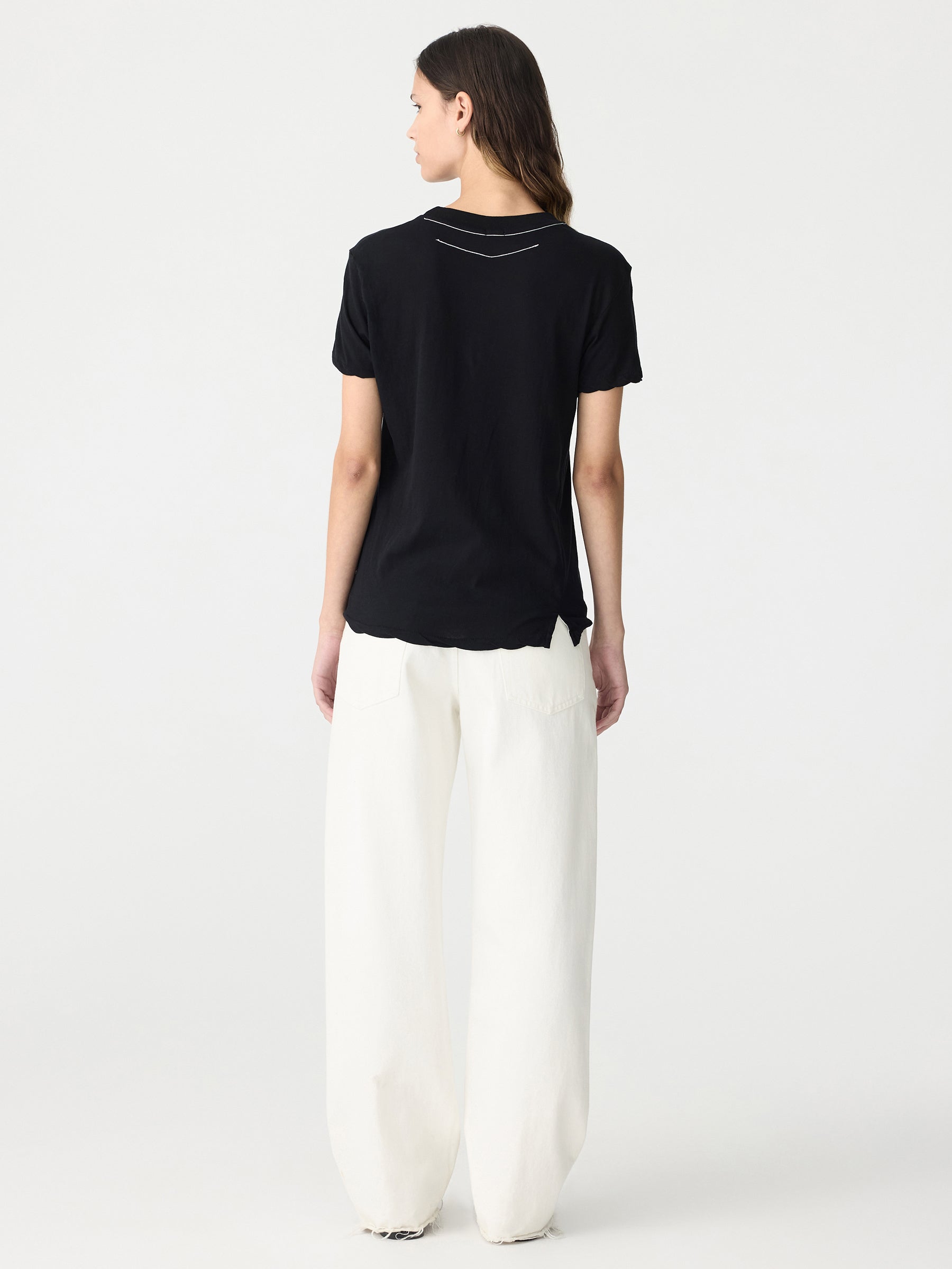 taking cues from masculine basics, the regular classic short sleeve t.shirt is designed a foundational wardrobe element. crafted in bassike's signature organic cotton jersey. the t.shirt boasts a vintage crew neckline, short sleeve silhouette and straight hem. distinguished by signature contrast topstitch detail on back neck.