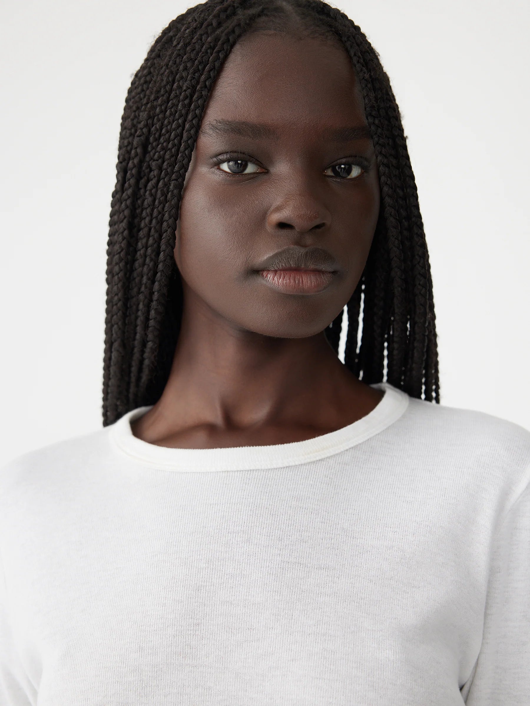Crafted from organic cotton superfine rib knitted in Australia, the Slim Fit Rib Long Sleeve Baby T-Shirt is designed for a slim fit in a cropped silhouette. This lightweight style features a classic crew neckline and signature Bassike chainstitch along the back neck. Complete with ribbed finishes along hem, cuffs and neckline.