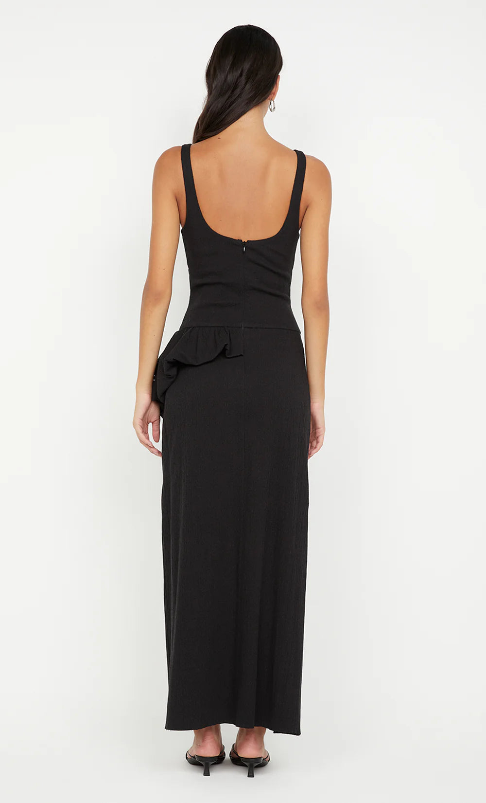 Rowena Asym Dress in Black. This elegant asymmetric dress features a flattering boat neckline and a unique bubble-finished skirt, creating a modern and sophisticated silhouette perfect for special occasions.
