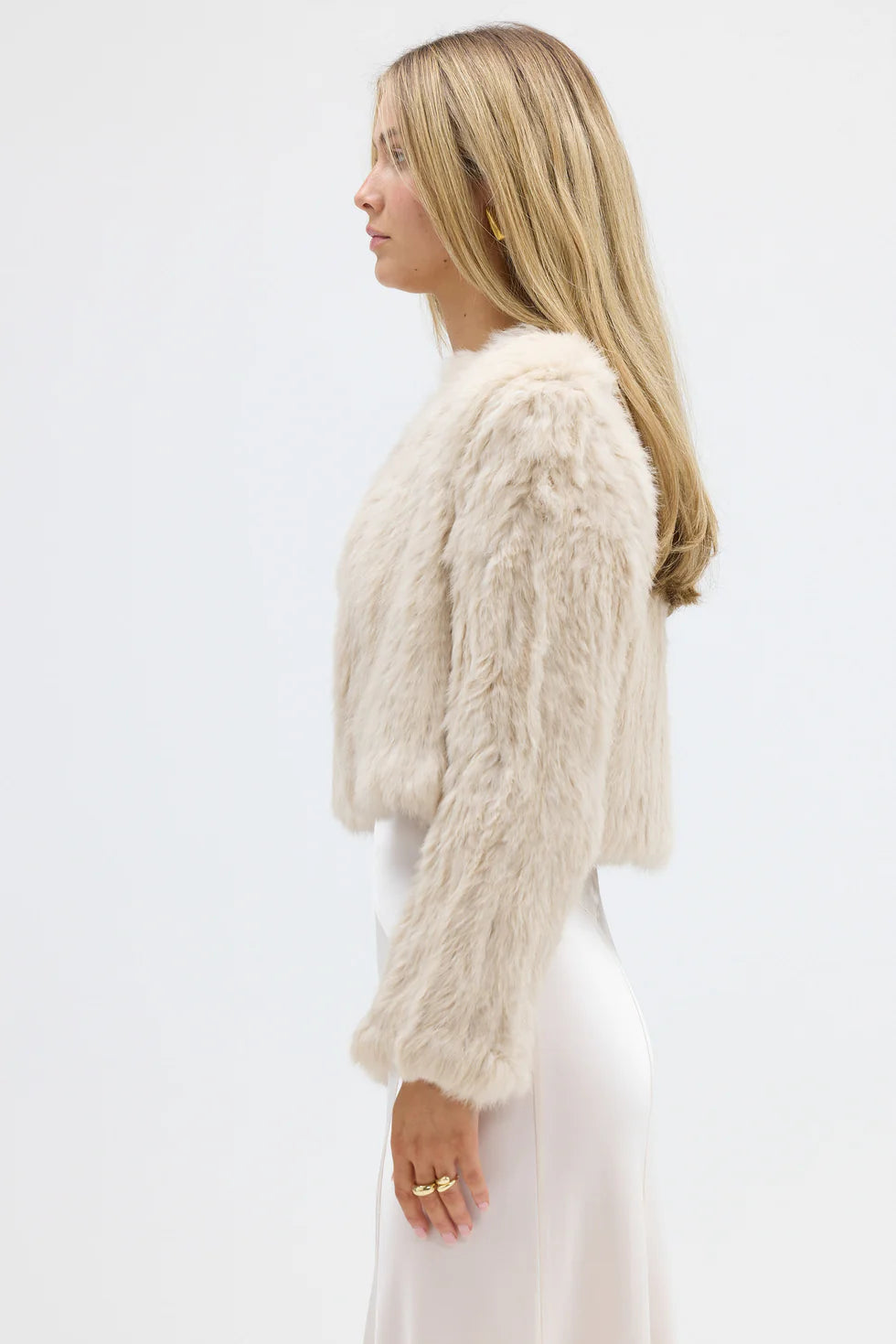 The Lola Jacket is the perfectly cropped evening jacket. Made from premium fur, this special super cosy piece has been hand knit to create a warm but light weight jacket. This piece is the perfect option for a special occasion, wedding or even dressy/casual look with your favourite jeans.