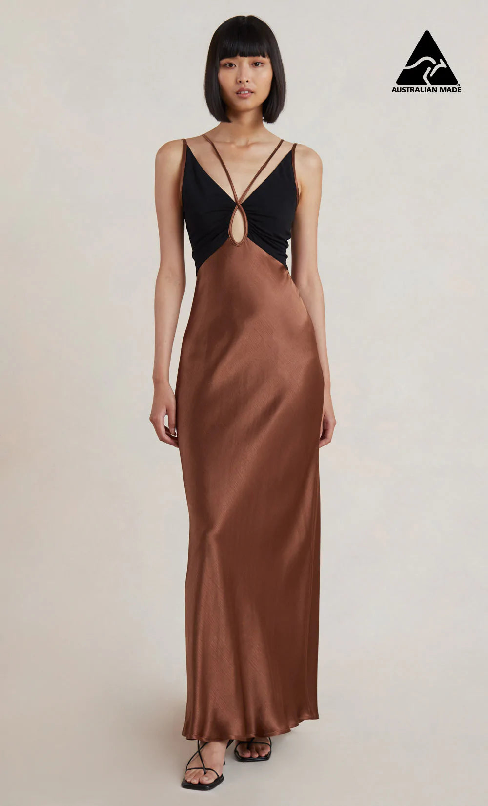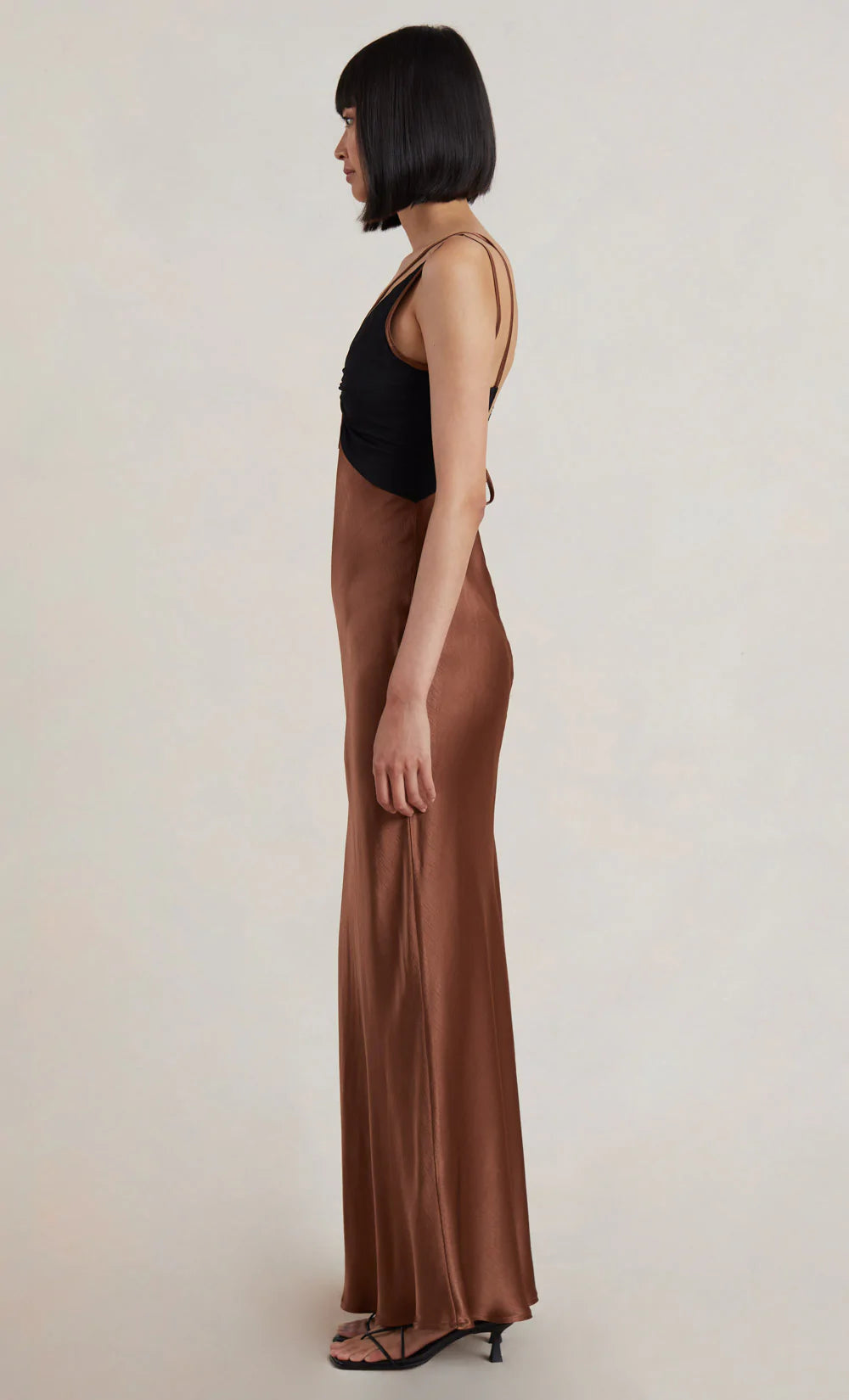 A statement eventwear style, the Kehlani V Dress is cut on the bias in an asymmetrical one-shoulder design. The maxi dress features a thigh-high split, flattering teardrop cut-outs and an open back, finished with contrasting rouleau straps.