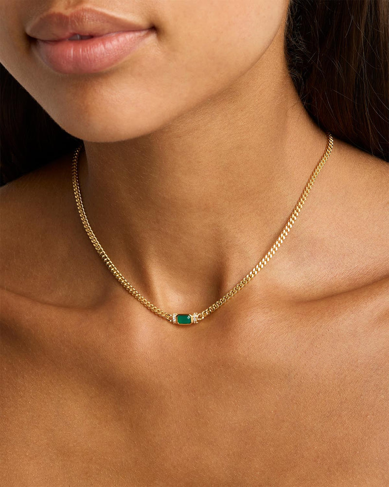 Be reminded of your inner power with our Strength Within Green Onyx Curb Choker. A bezel set natural green onyx is framed by two pave cubic zirconias, symbolic of the patience and purpose you hold on your journey. Crafted with a bold curb chain, this choker can be styled as a statement piece in your stack.
