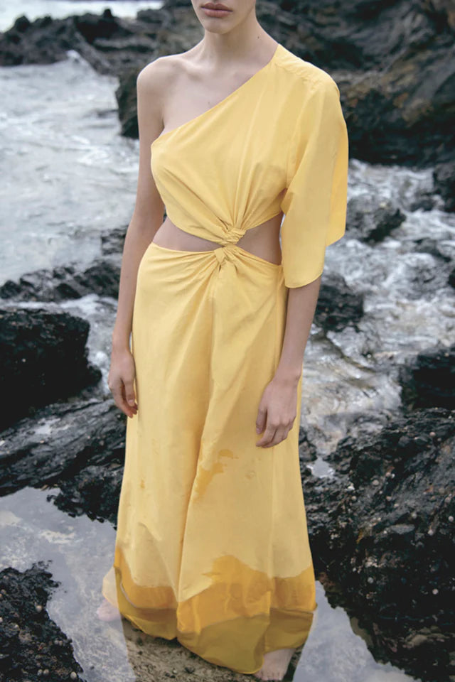 Designed to stand out through its unique asymmetrical twist and rich hue, the wally dress is the perfect day dress. Featured with waist cut-outs that follow through to the back, inseam pockets at the side and a floor grazing skirt length. Slide on your best eyewear and have a tote in hand for the day ahead.Select your size