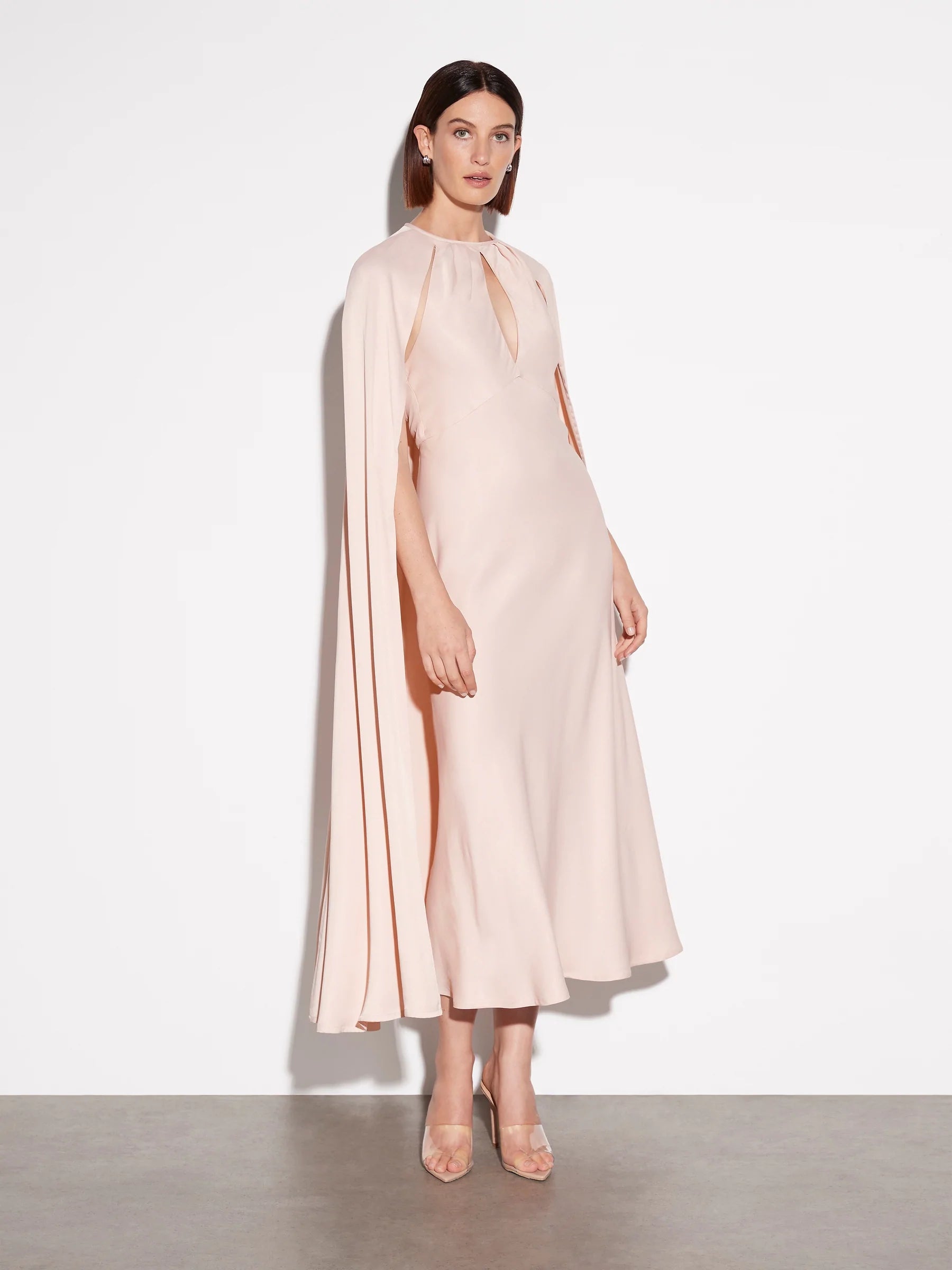 The Halo Dress is an elegant cape dress, cut from a luxurious matte satin bamboo/viscose fabrication. This statement dress features a halter back covered by a long flowy cape attached at the neck and falling from the shoulders into a flowy hemline. Bias cut through the body the dress features a round neckline and keyhole front detailing. The Halo dress is a perfect showstopper for your formal events or the modern-day mother of the bride.