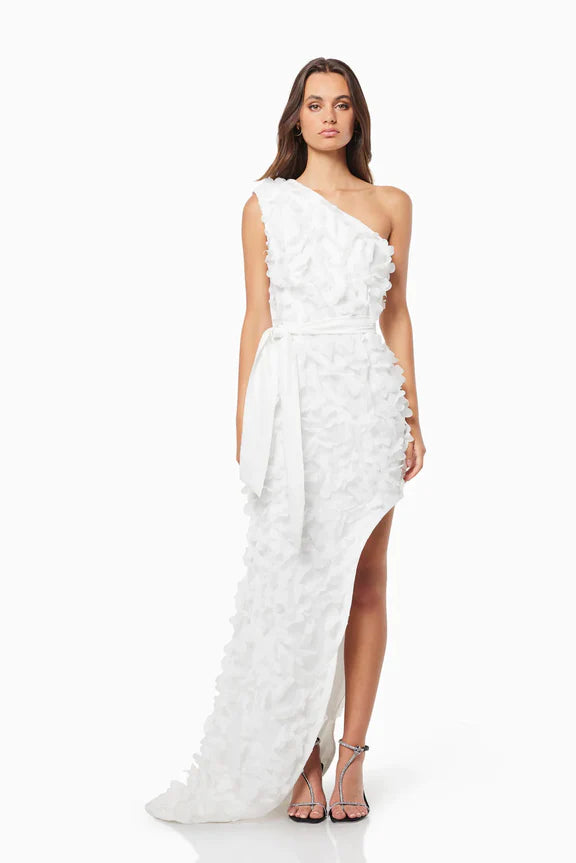DETAILS- Asymmetrical design- Fitted and flared- 3D georgette- Side high split- Adjustable wrap around belt-S: 100% POLYESTER L: 90% POLYESTER 10% SPANDEX