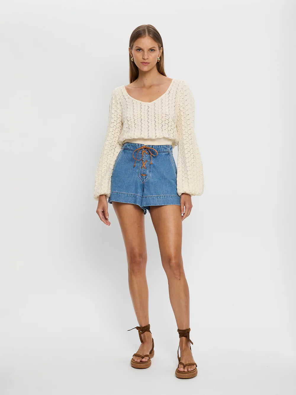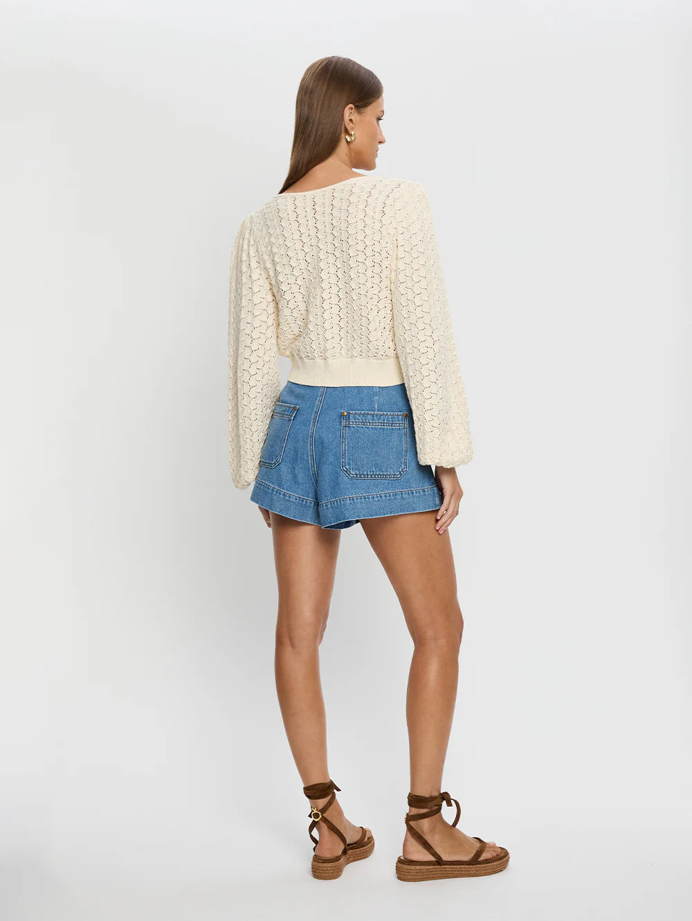 The Bella Knit Top is a reversible silhouette featuring long blouson sleeves with shoulder gathering complete with ribbed cuffs an