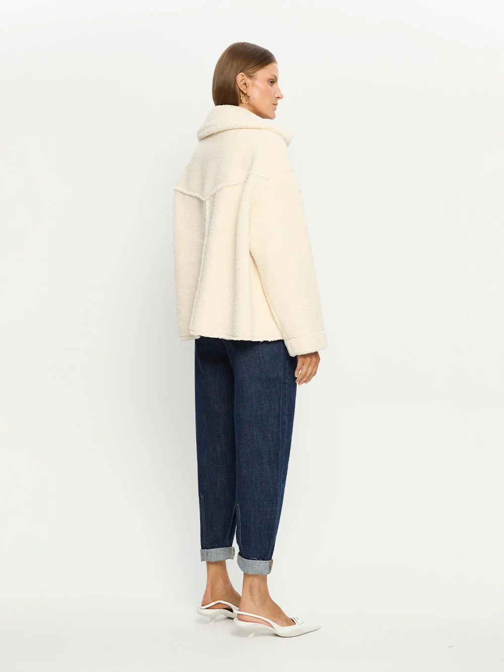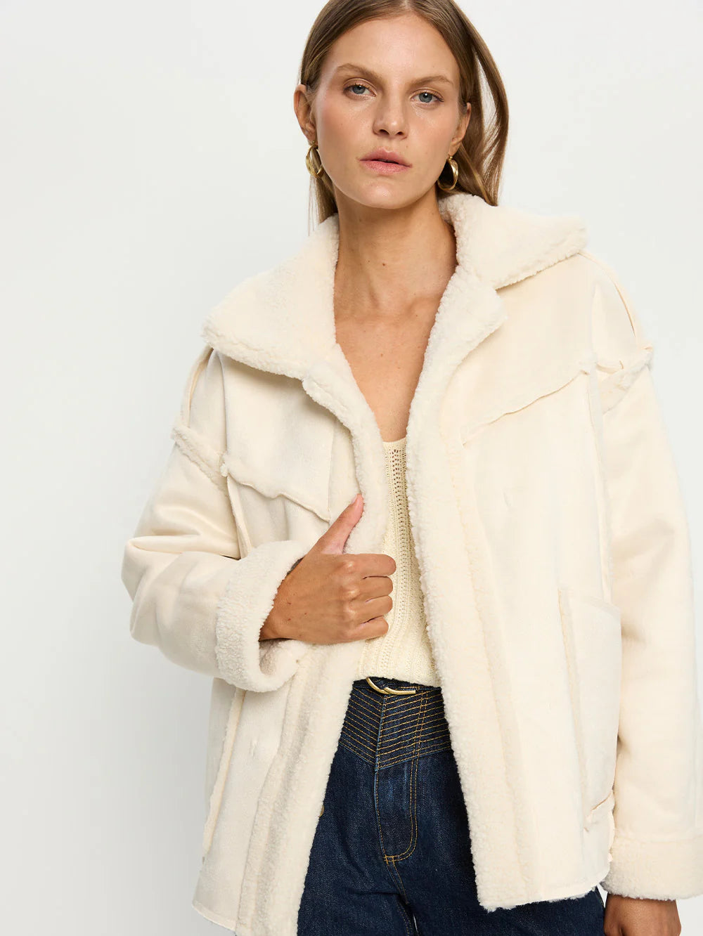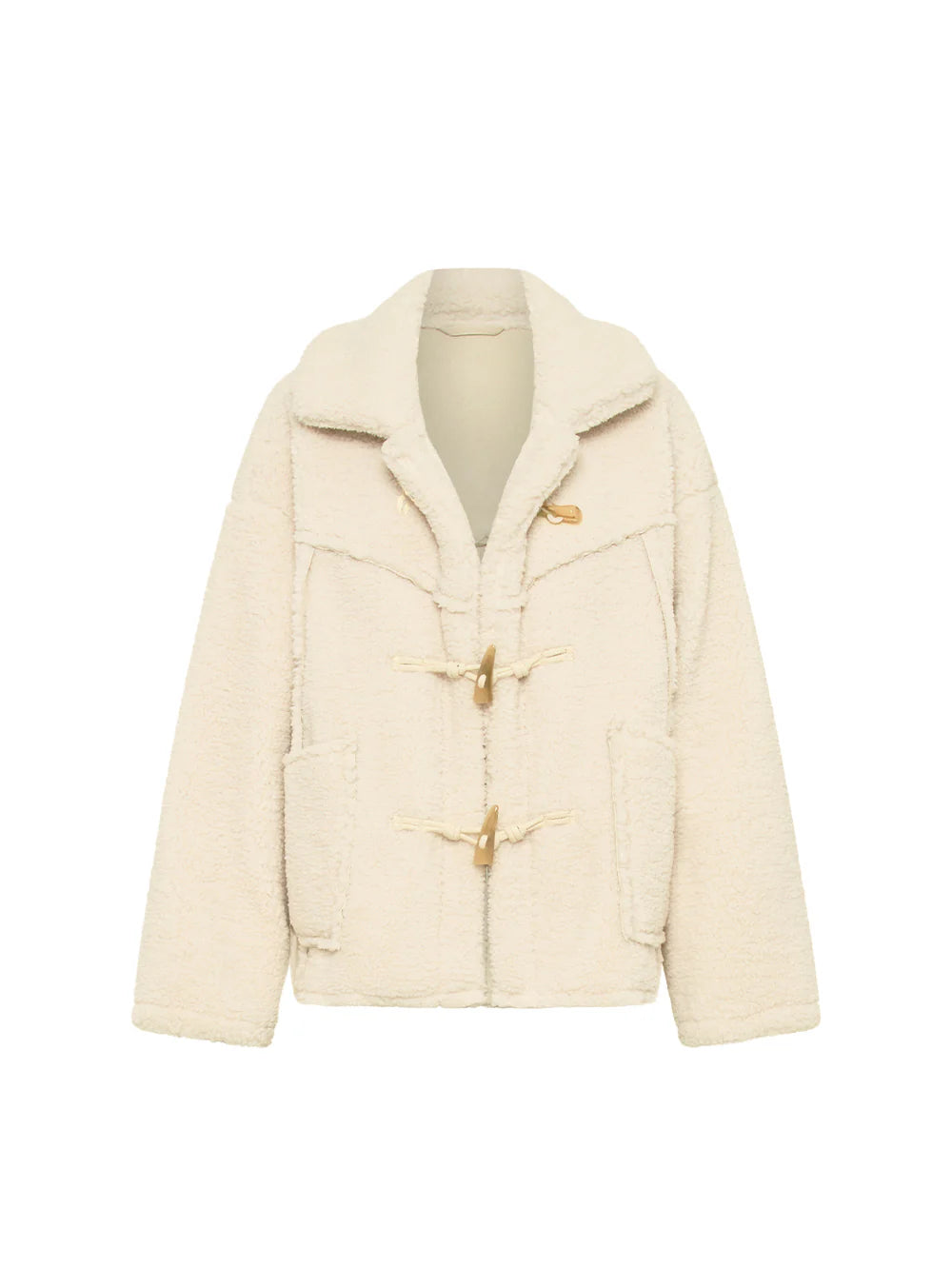 The Lianna Jacket in cream is fully reversible with suede internally. Featuring a relaxed fit with a drop shoulder, patch pockets complete with toggle buttons closure.