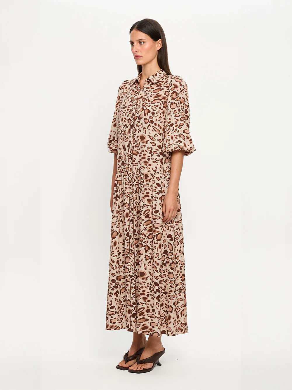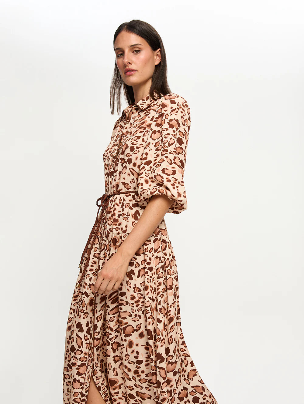 Paris is a two toned leopard print on a soft neutral base. The Paris Maxi Dress features slight blouson sleeves, button through front complete with a removable braided belt.