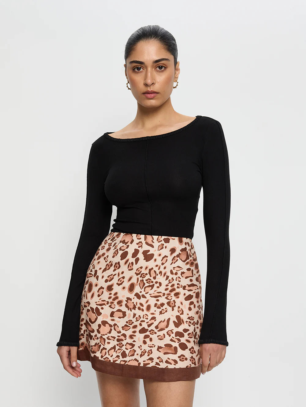 Paris is a two toned leopard print on a soft neutral base. The Paris Mini Skirt is a fitted A-line silhouette and features an exposed back zip with signature gold hardware, complete with a contrast chocolate brown hem band. Pair with then Paris Shirt to complete the look.