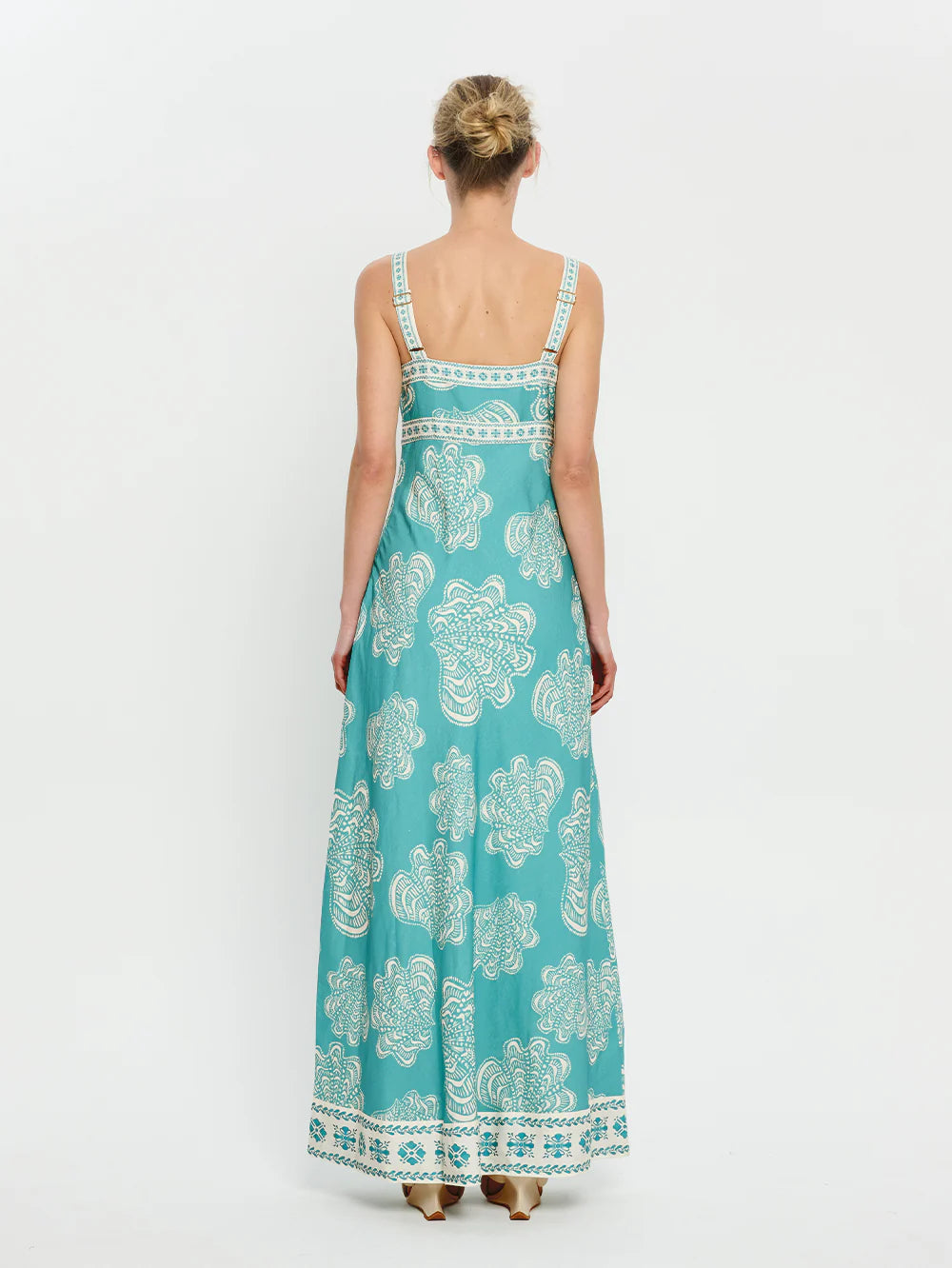 Skye is hand painted motif shells on a vibrant aqua blue base. The Skye Maxi Dress features a straight neckline, adjustable shoulder straps and subtle flared hem complete with a contrast print border throughout.