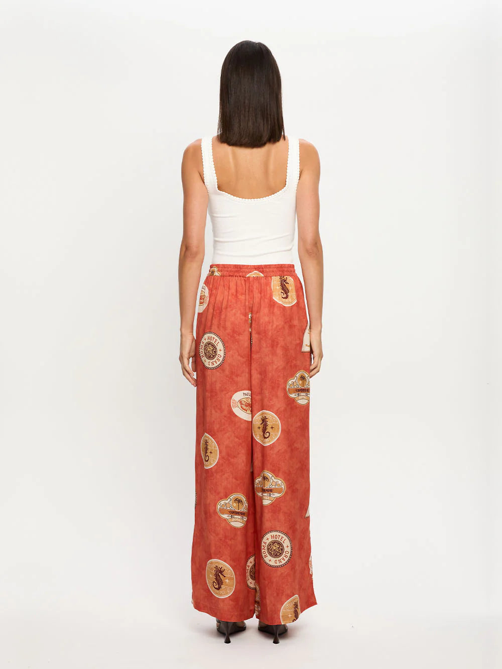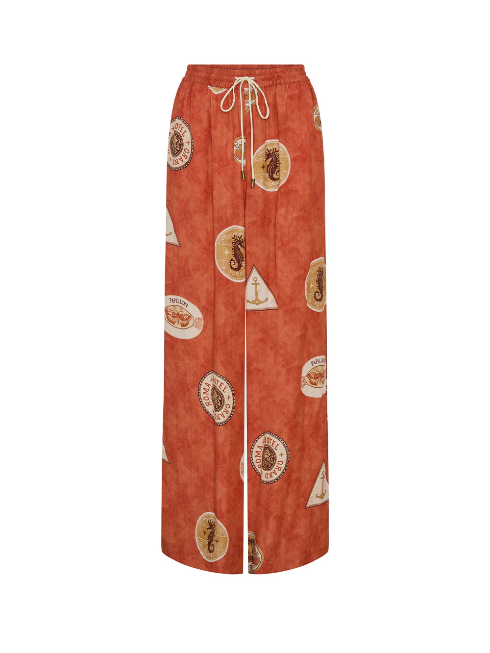Vacanza is vintage motifs set against a rich, warm red base. The Vacanza Pant is a straight leg pant featuring an elasticated waistband with drawcord, complete with in seam pockets.