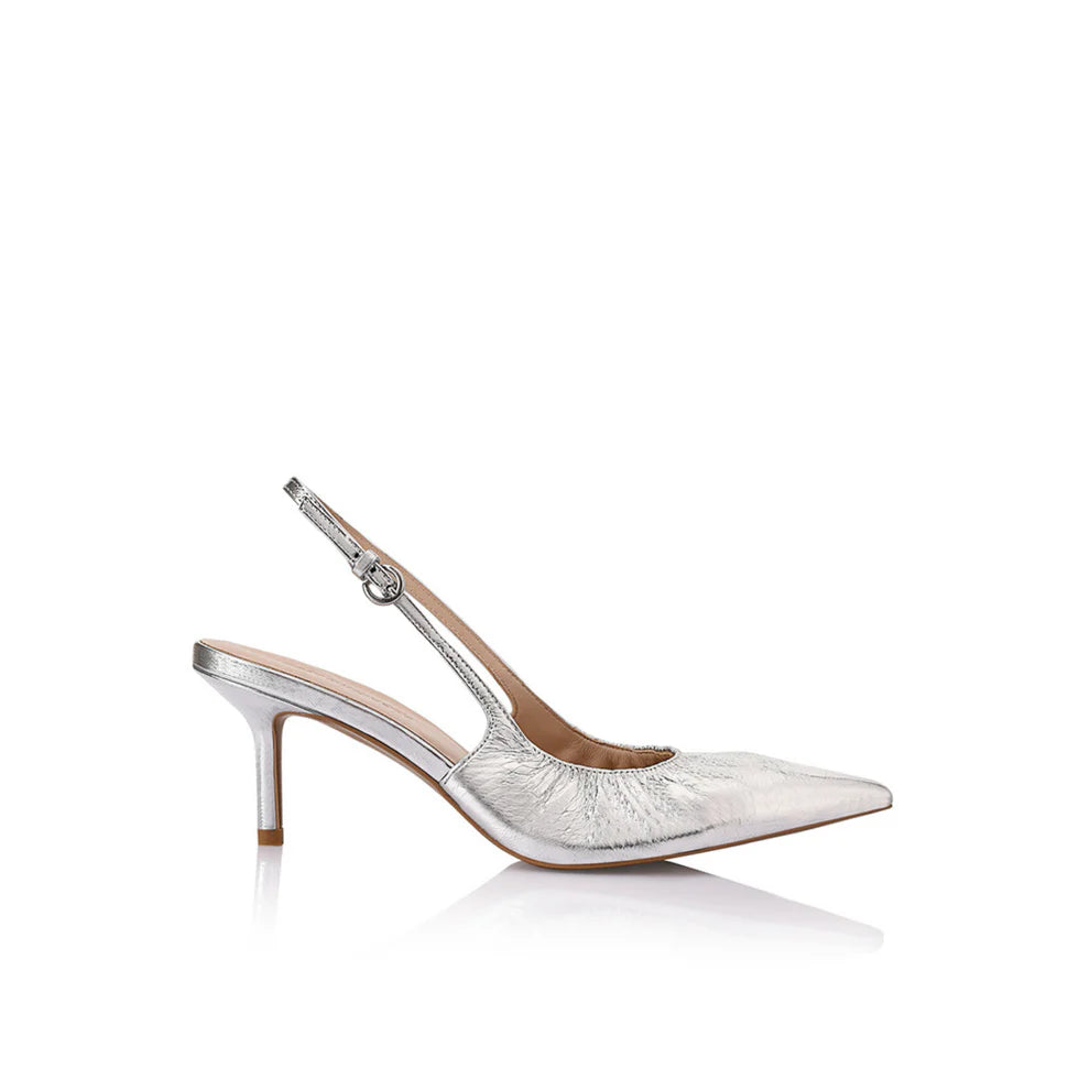 Introducing Charlotte, an LW signature reimagined with a refined stiletto heel. This chic slingback, in an exquisite icy silver with a distinctive crinkle metallic finish and delicate ruching, will effortlessly add texture to your look.