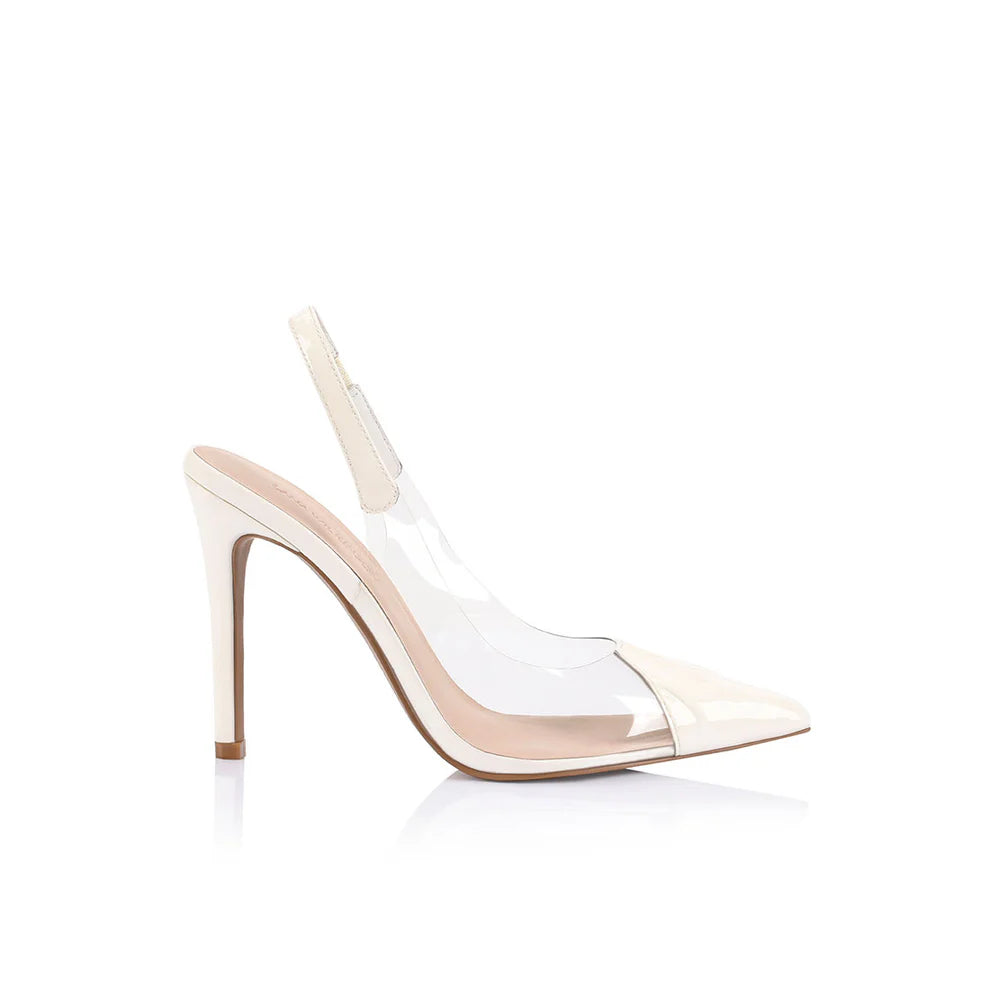 Introducing Romy, the sophisticated evolution of the iconic Rhiannon style. This refined pointed-toe pump, crafted from sleek vinylite and white patent leather, features a chic slingback design and a striking stiletto heel. The distinctive ruched toe cap adds a touch of modern elegance that seamlessly blends classic charm with contemporary flair.