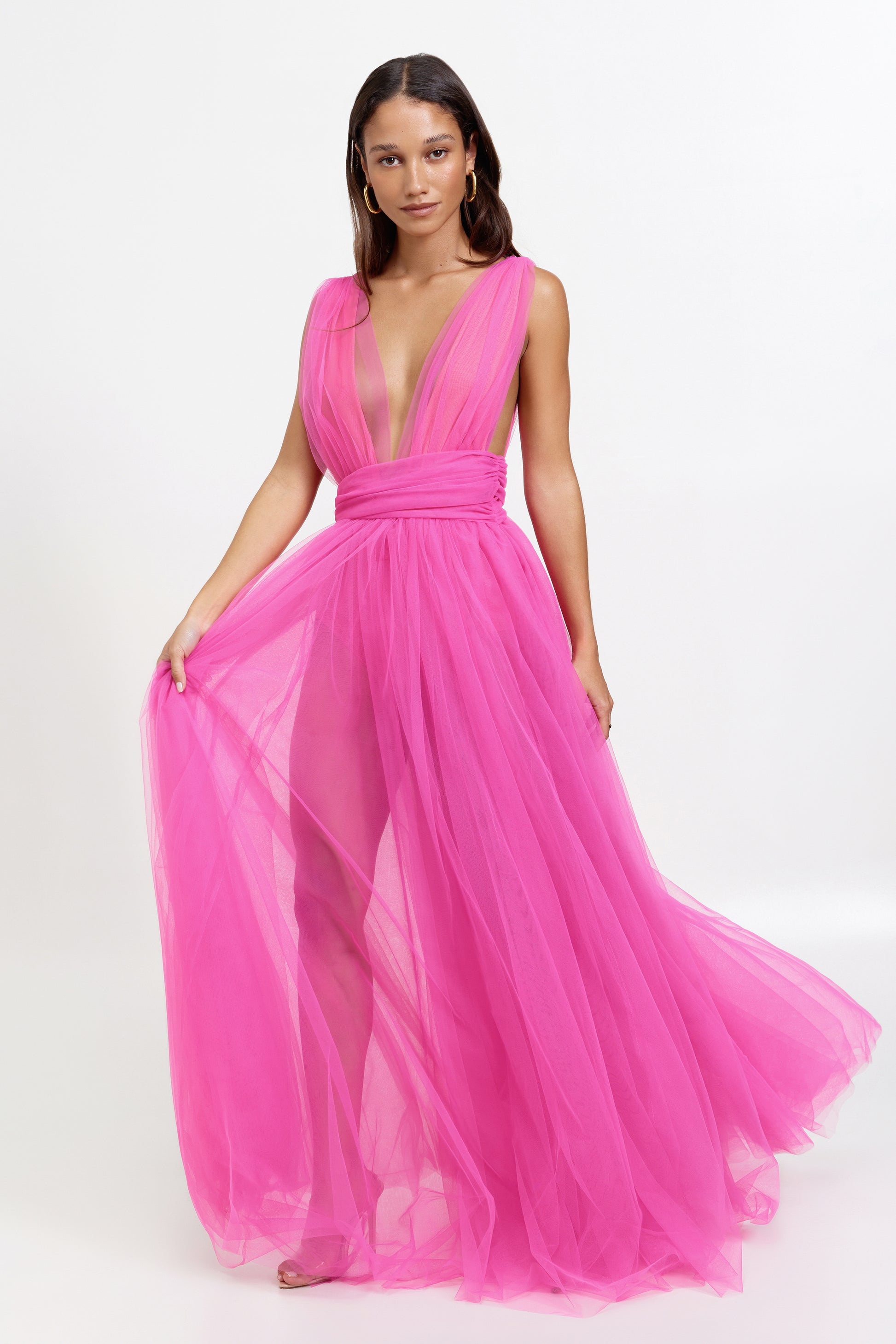 The Karmina Dress is crafted from a soft, romantic tulle that is gathered into a full, flowing skirt. The dress features a deep plunging neckline and back, and finished with an asymmetric waistband. The dress is fitted with an inbuilt mesh bodysuit for comfort and protection.
