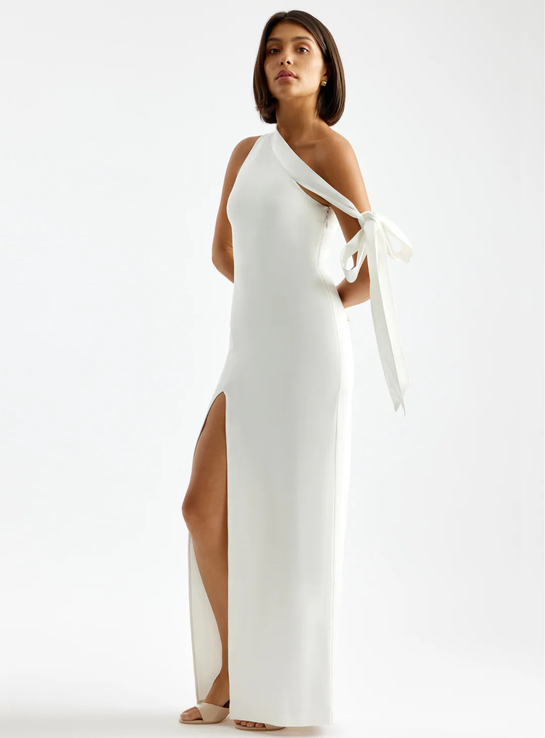The Sidney Dress, crafted from a heavyweight stretch ponte fabric is a bold and striking statement piece. The maxi length, thigh high split and one shoulder tie detail enhance the elegant nature of the dress
