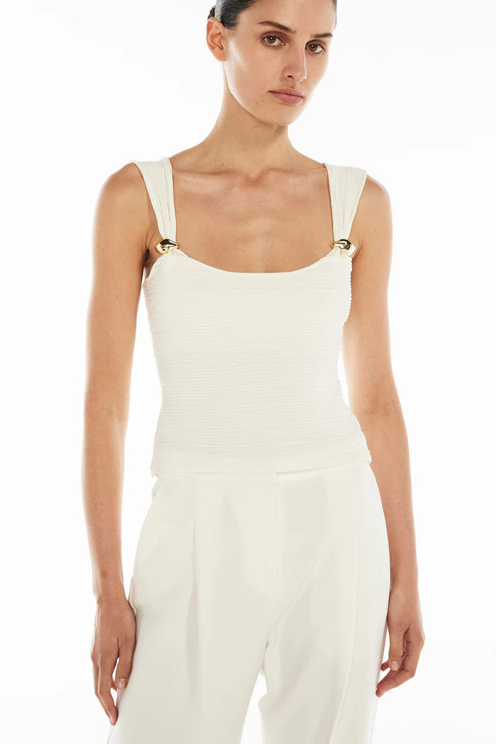 The Body Language Knit Top features a wide square neckline and thick shoulder straps, accented with exclusive MANNING CARTELL gold-tone hardware. Crafted from soft, stretch ribbed knit, it combines comfort with a touch of elegance.