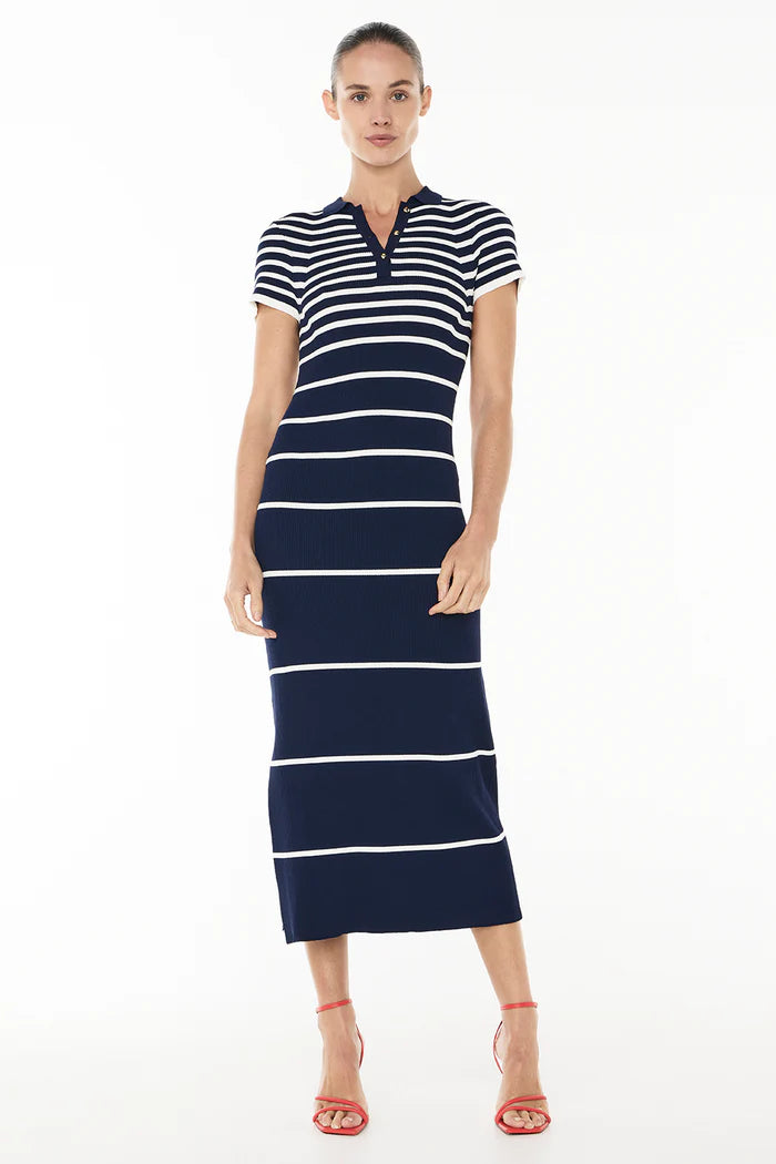 A modern take on a classic, this knit polo dress features blue and ivory horizontal stripes, a classic collar, and cap sleeves. The fitted silhouette is enhanced by rib panel detailing, while signature MC bauble buttons add a polished finish to the center-front placket. Midi length for a sleek, refined look that works from day to night.