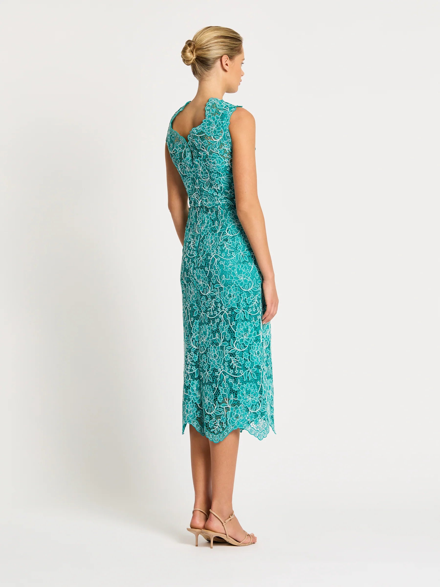 Crafted from a captivating sky-blue floral guipure lace with contrast floral embroidery, the elegant silhouette of the Alessia Shiftfeatures beautifully scalloped embroidery around the high neckline, V-neck back and hem. Fitted through the body, finishing below the knee and with a matching stretch satin slip, the Alessia Shift will leave a lasting impression at any day or evening event.