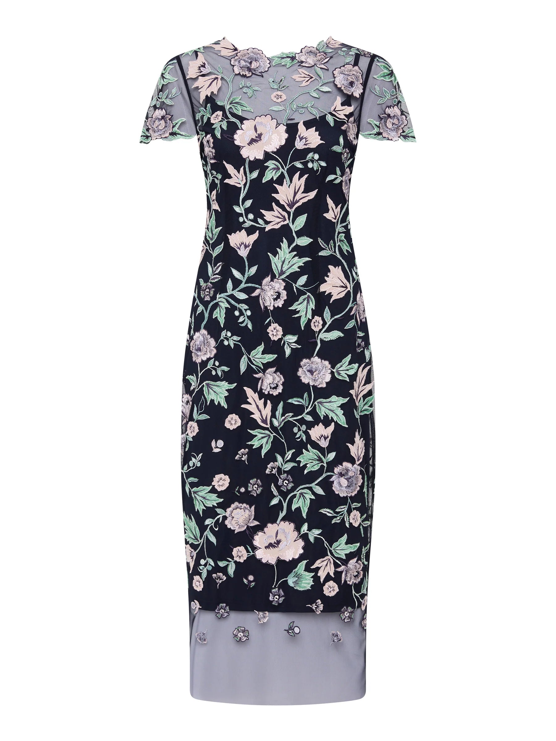 The luxurious applique of delicate pink and violet flowers with green highlights embroidered onto a dark navy fine tulle creates the captivating look of the Halcyon Shift. Designed with a figure-flattering shift silhouette, it finishes at mid-calf with an invisible zip back closure.