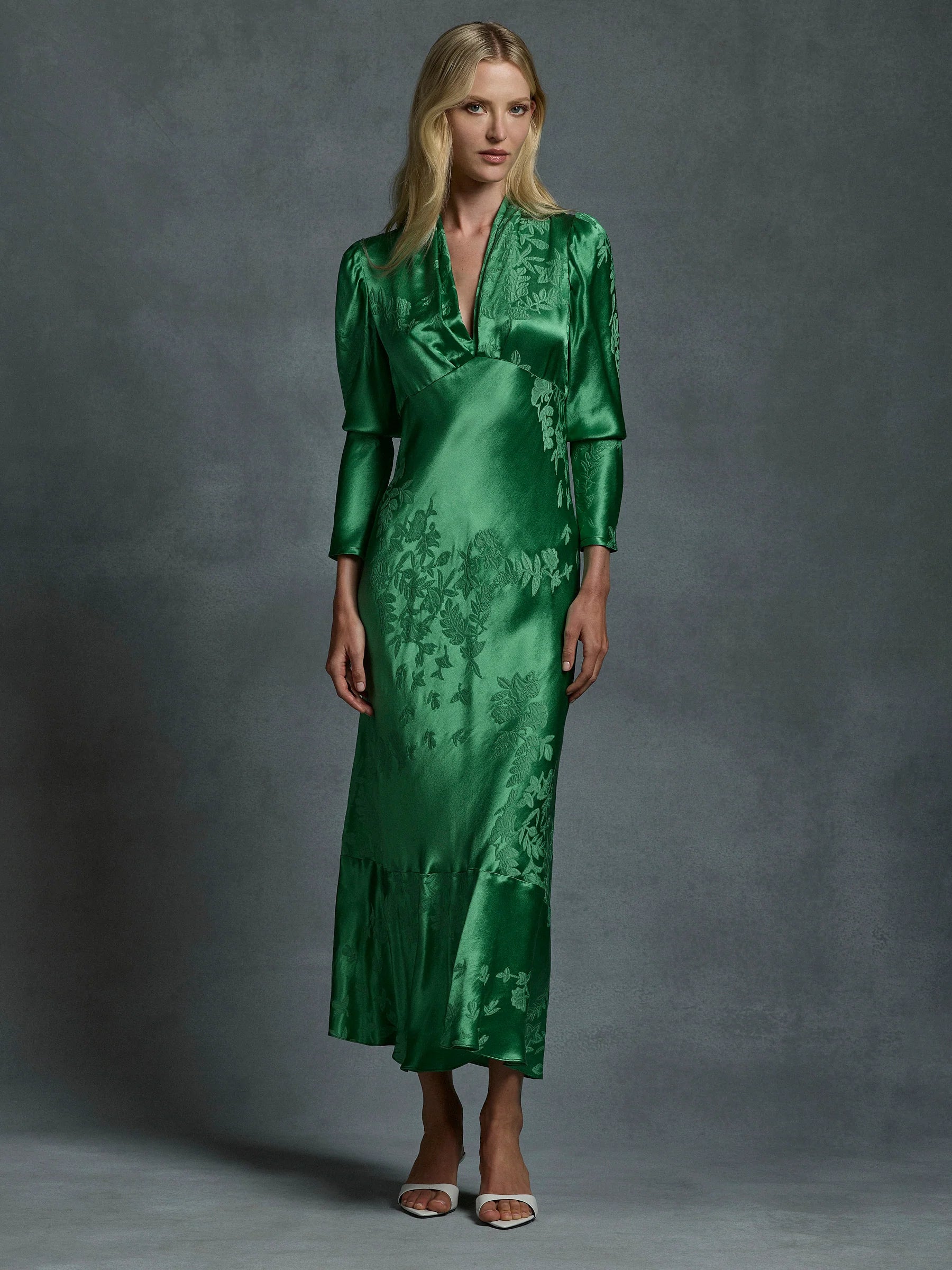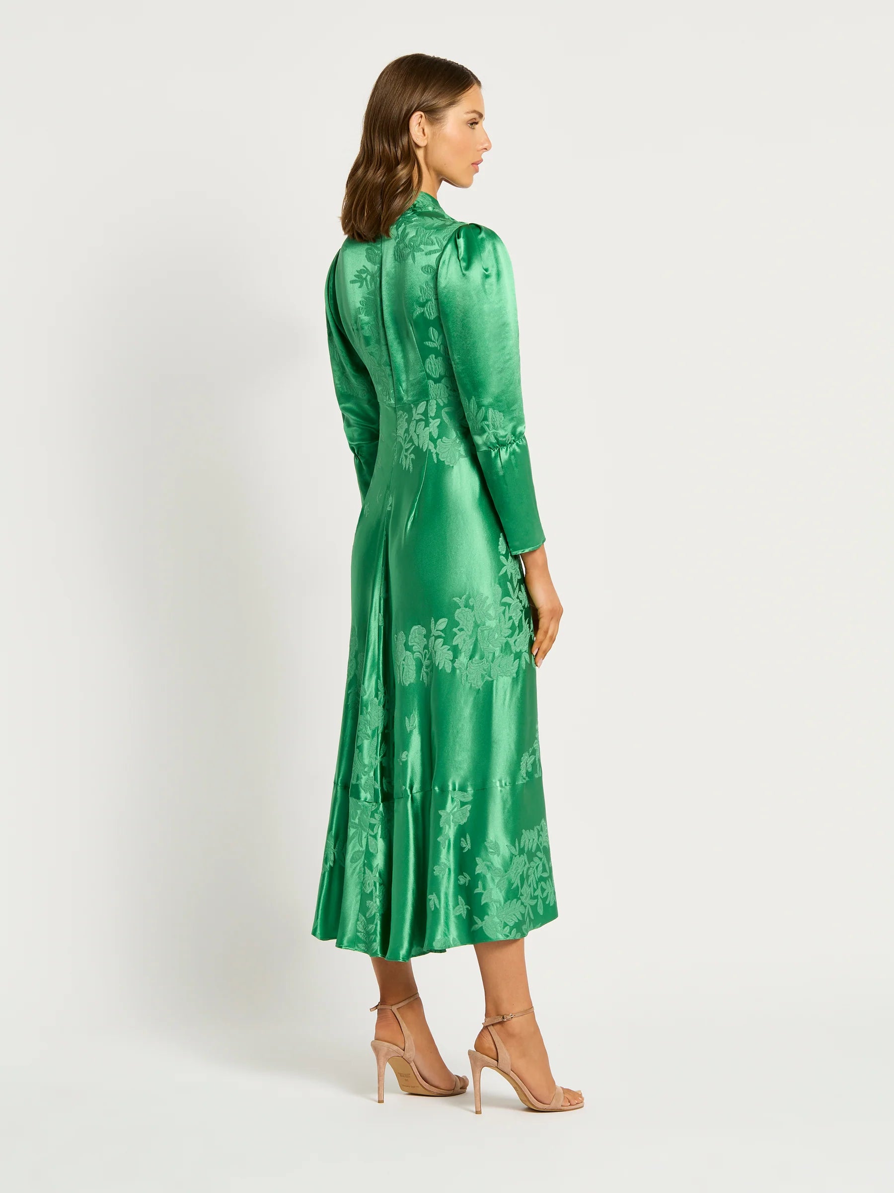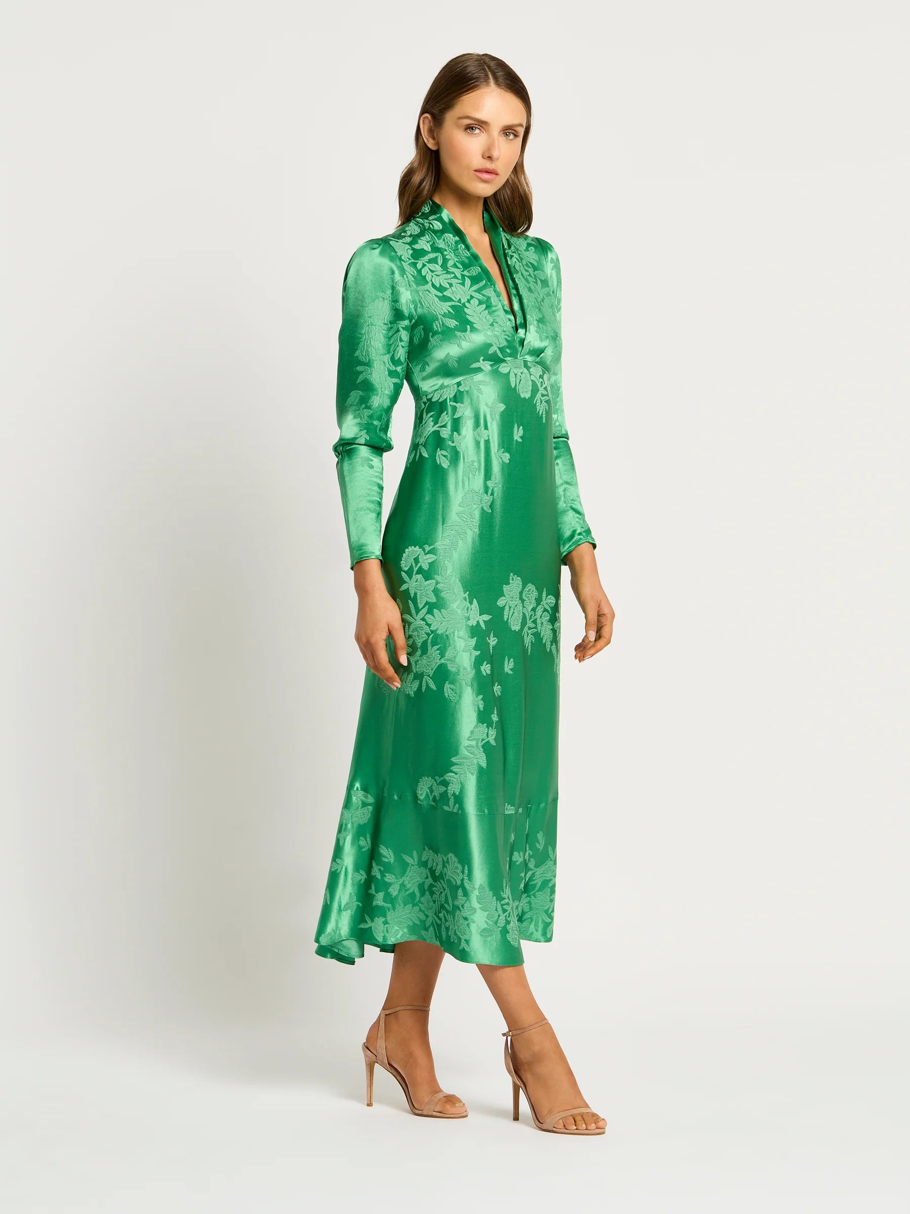 The Selena V-Neck is crafted from a silk viscose floral jacquard. It features a tucked V-neckline with an under-bust seam falling to an A-Line hem. The tucked full-length sleeve falls into a narrow cuff which can be held up with a hidden elastic under the elbow. The perfect dress for any cocktail, party or daytime event.