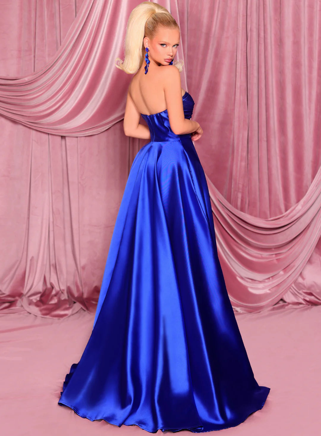 A gorgeous full length gown by Nicoletta NC3026. A feminine style featuring a sweetheart strapless neckline with centre peep hole, a-line skirt and thigh high split.