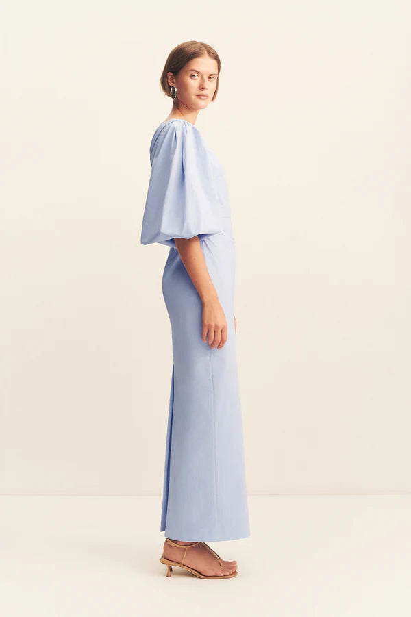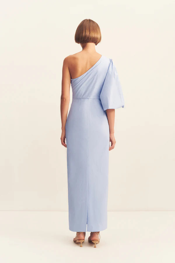 One shoulder balloon sleeve maxi dress in cornflower blue in a premium stretch cotton blend.