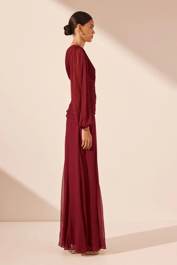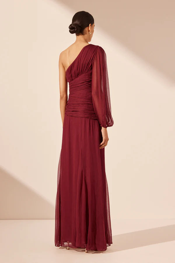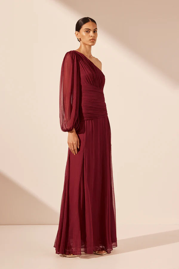 One shoulder side split maxi dress in a light weight semi-sheer chiffon.