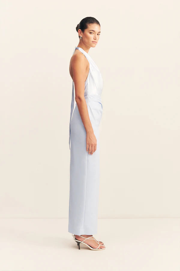 Spliced cowl neck maxi dress in seabreeze in a premium stretch cotton blend contrasted with a satin finish LENZING™ ECOVERO™.