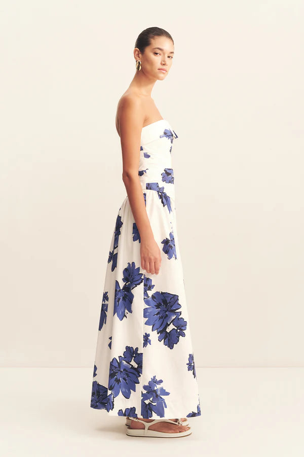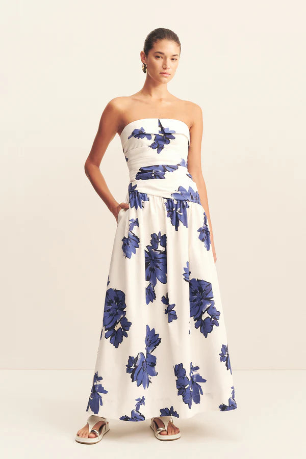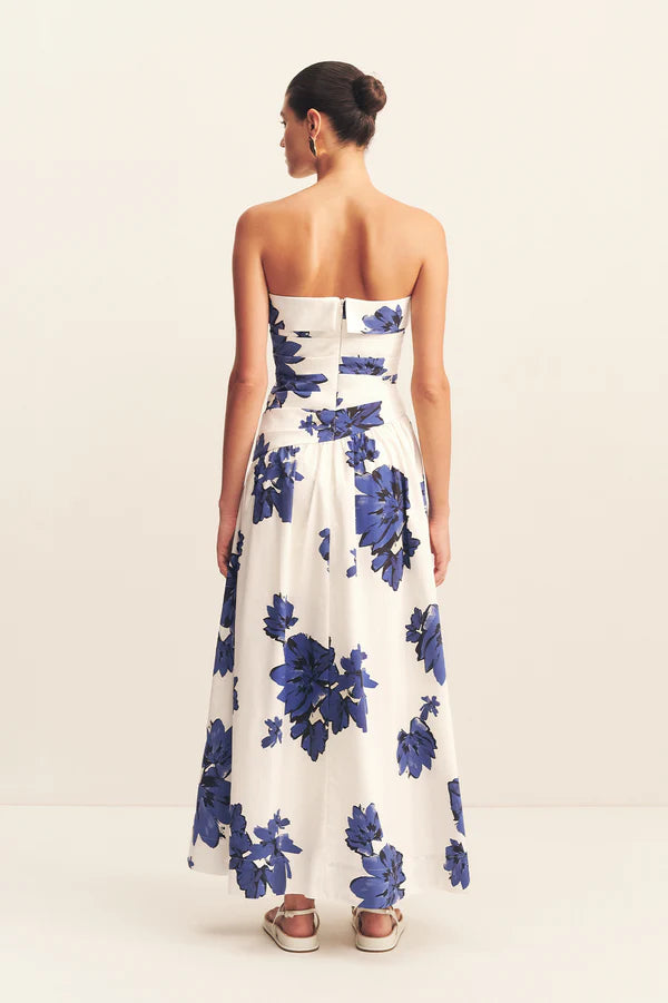 Strapless draped maxi dress in the floral midnight wallpaper print in an organic cotton poplin.