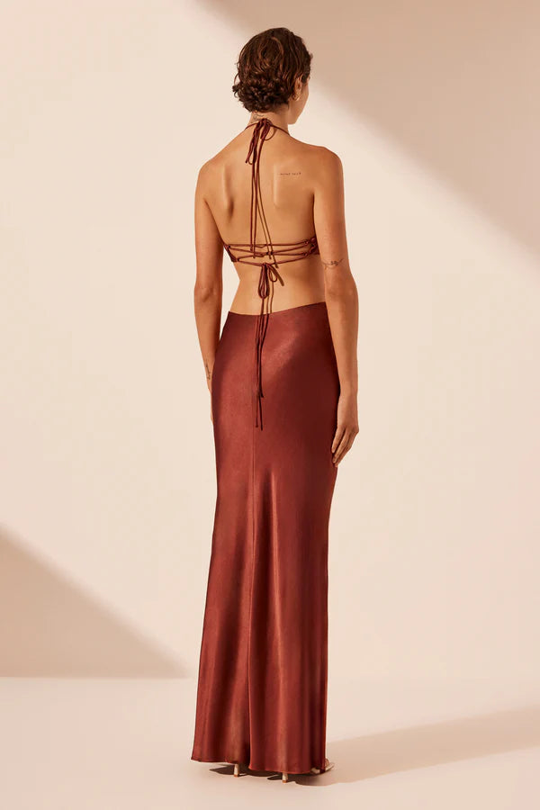 Asymmetrical cowl tie maxi dress in mahogany in a LENZING™ ECOVERO™ with a luxurious satin finish.