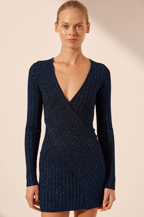 Long sleeve wrap detail mini dress in night sky in a metallic rib knit.
