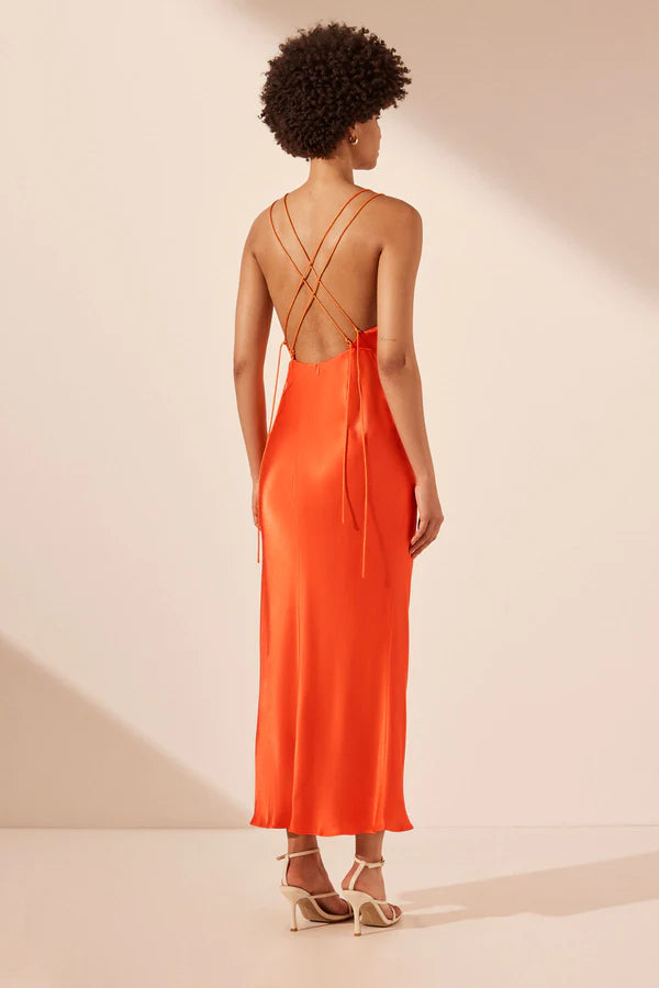 Plunged double strap cross back midi dress in a LENZING™ ECOVERO™ with luxurious satin finish.