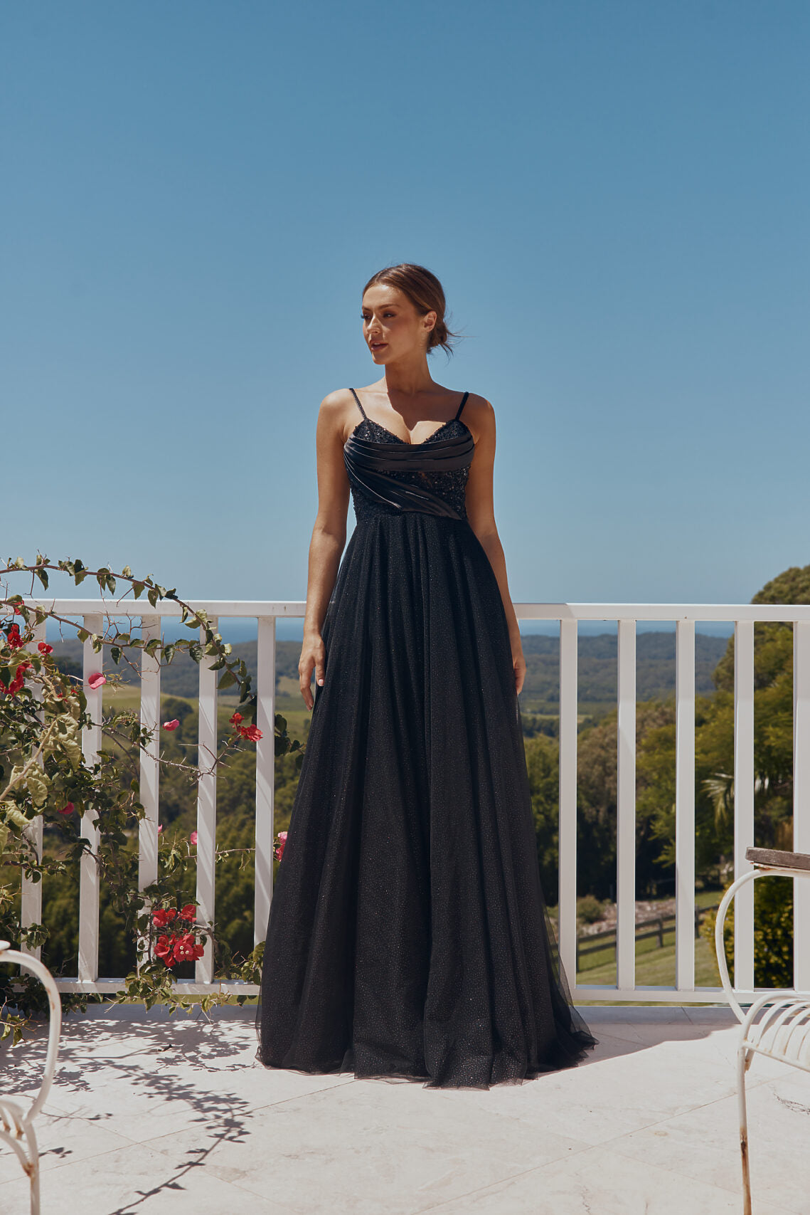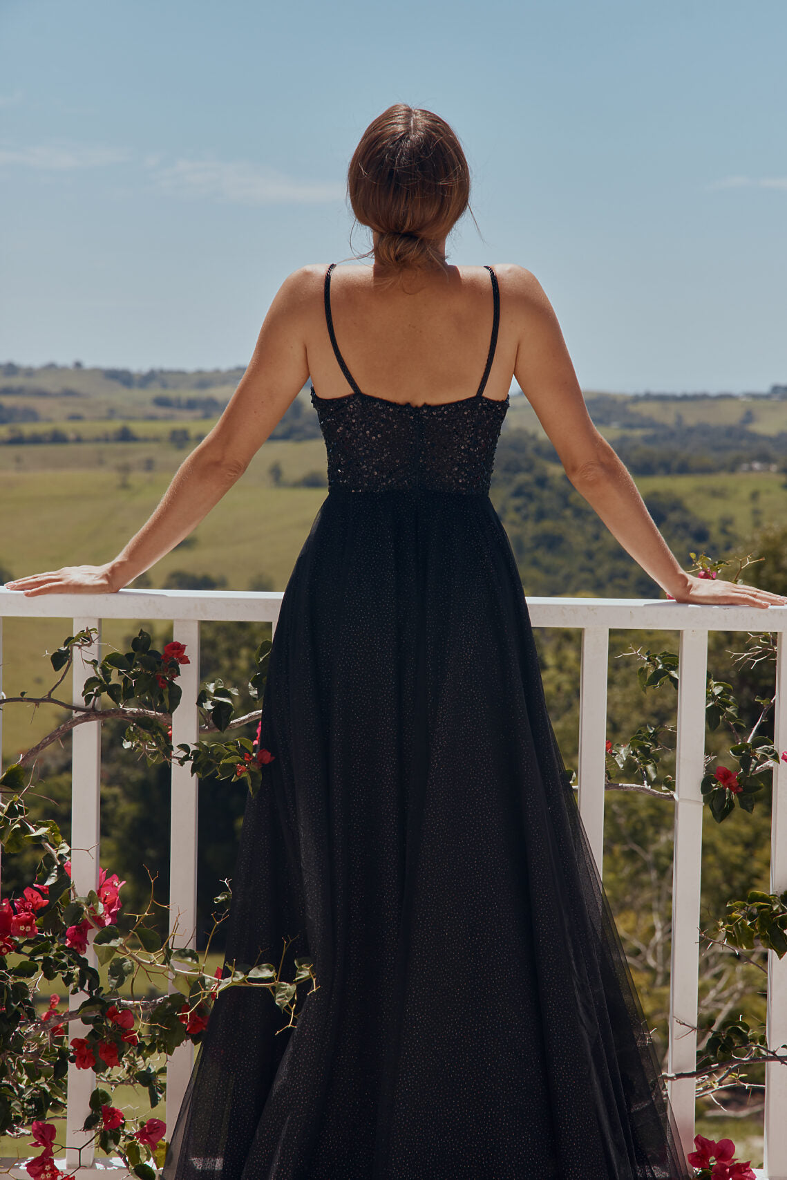 Let’s talk about the skirt! It’s full and gathered, creating a beautiful A-line silhouette that flatters your figure. But here’s the best part—the skirt has a glittery underlay tulle that will make you feel like you’re walking on stardust. With every step you take, you’ll be leaving a trail of shimmer and shine.
